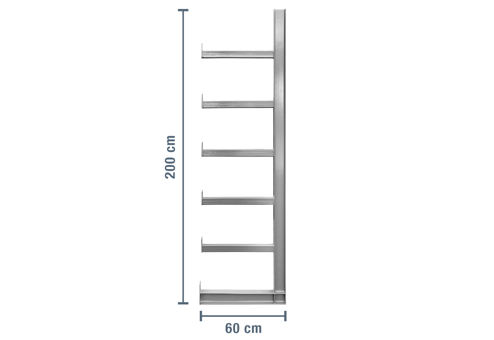 Single-sided, 2 m high stand for the cantilever rack KR2500F with 50 cm long, welded cantilever arms with a total depth of 60 cm. Maximum load per arm 250 kg. Perfect for expanding your existing cantilever rack.
