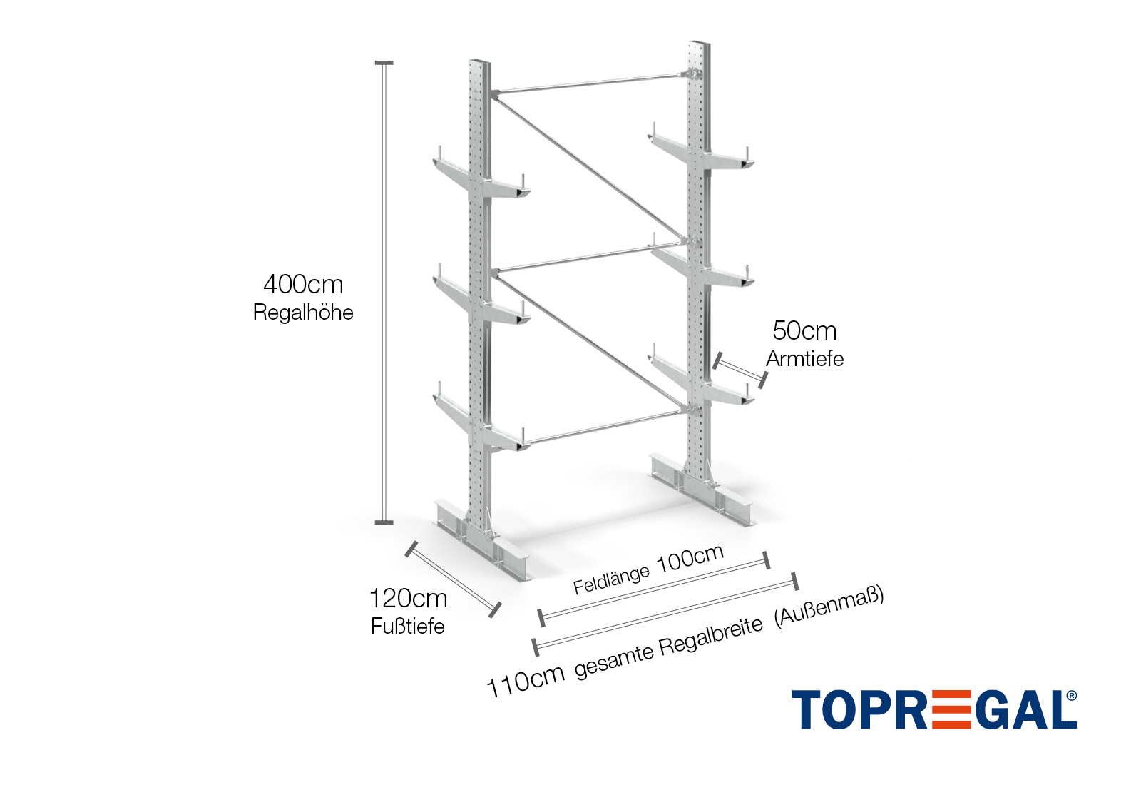 The axial dimension is the internal dimension between two shelf uprights. Depending on the cantilever type, we offer these fields in 120 cm (KR2500) and in 100 cm / 150 cm (KR3000 / KR6000).