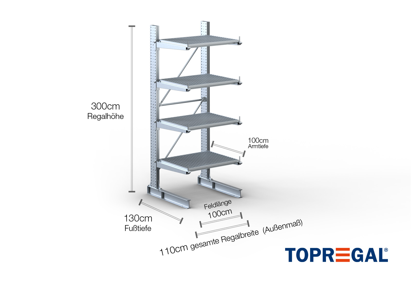 1,1 m cantilever rack KR3000 / Hot-dip galvanised / One-sided / 3 m high / 100 cm cantilever depth / 4 levels / rack layer Galvanised mesh