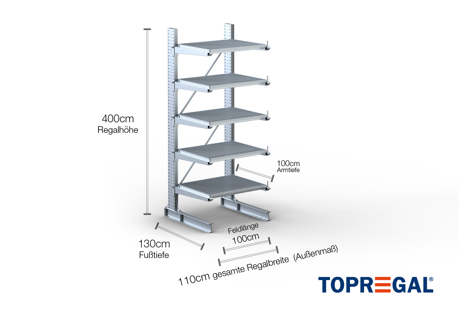 This cantilever rack in a single-sided design with a width of 1,1 m is 4 m high, with an overall depth of 130 cm, and features 5 cantilever levels, with a cantilever depth of 100 cm. The maximum load per cantilever is 500 kg. The cantilevers can be attached at individual heights in increments of 50 mm and are secured with safety bolts and pins. The foot parts can also be used as a storage level (depending on the goods). To protect the load from accidentally slipping, roll-off protection can be attached at the end of each cantilever. This is included as standard in the delivery volume.