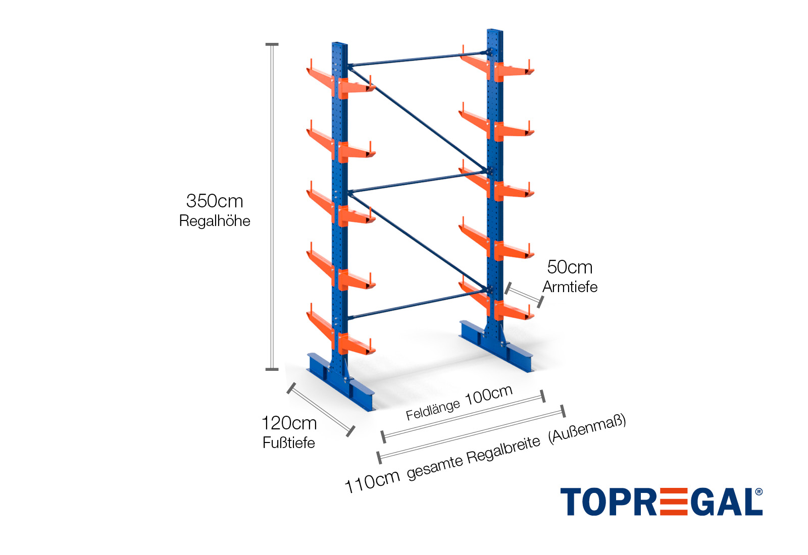 1,1 m cantilever rack KR3000 / Painted / Double-sided / 3,5 m high / 50 cm cantilever depth / 5 levels