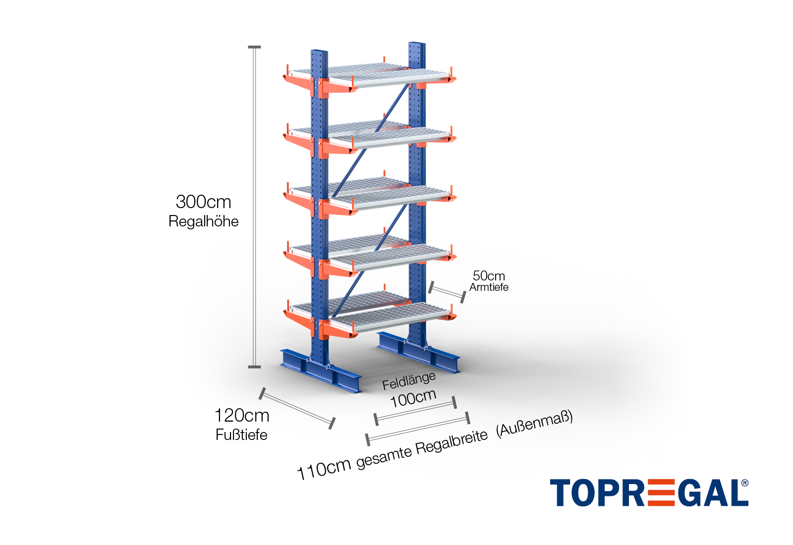 The axial dimension is the internal dimension between two shelf uprights. Depending on the cantilever type, we offer these fields in 120 cm (KR2500) and in 100 cm / 150 cm (KR3000 / KR6000).