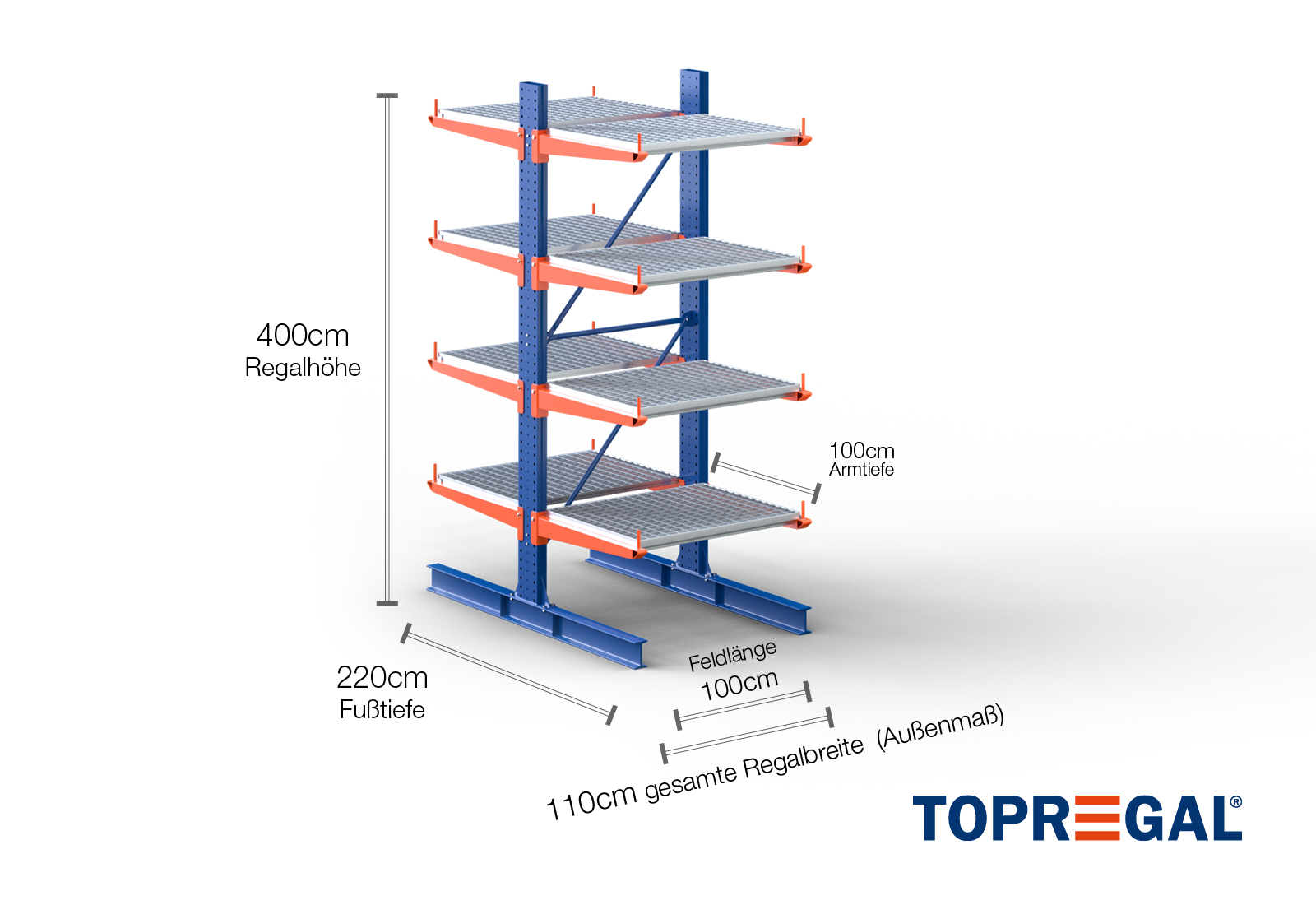 This cantilever rack in a double-sided design with a width of 1,1 m is 4 m high, with an overall depth of 220 cm, and features 4 cantilever levels, with a cantilever depth of 100 cm. The maximum load per cantilever is 500 kg. The cantilevers can be attached at individual heights in increments of 50 mm and are secured with safety bolts and pins. The foot parts can also be used as a storage level (depending on the goods). To protect the load from accidentally slipping, roll-off protection can be attached at the end of each cantilever. This is included as standard in the delivery volume. The maximum unit load capacity (even total load between two uprights) is 3.000 kg.
