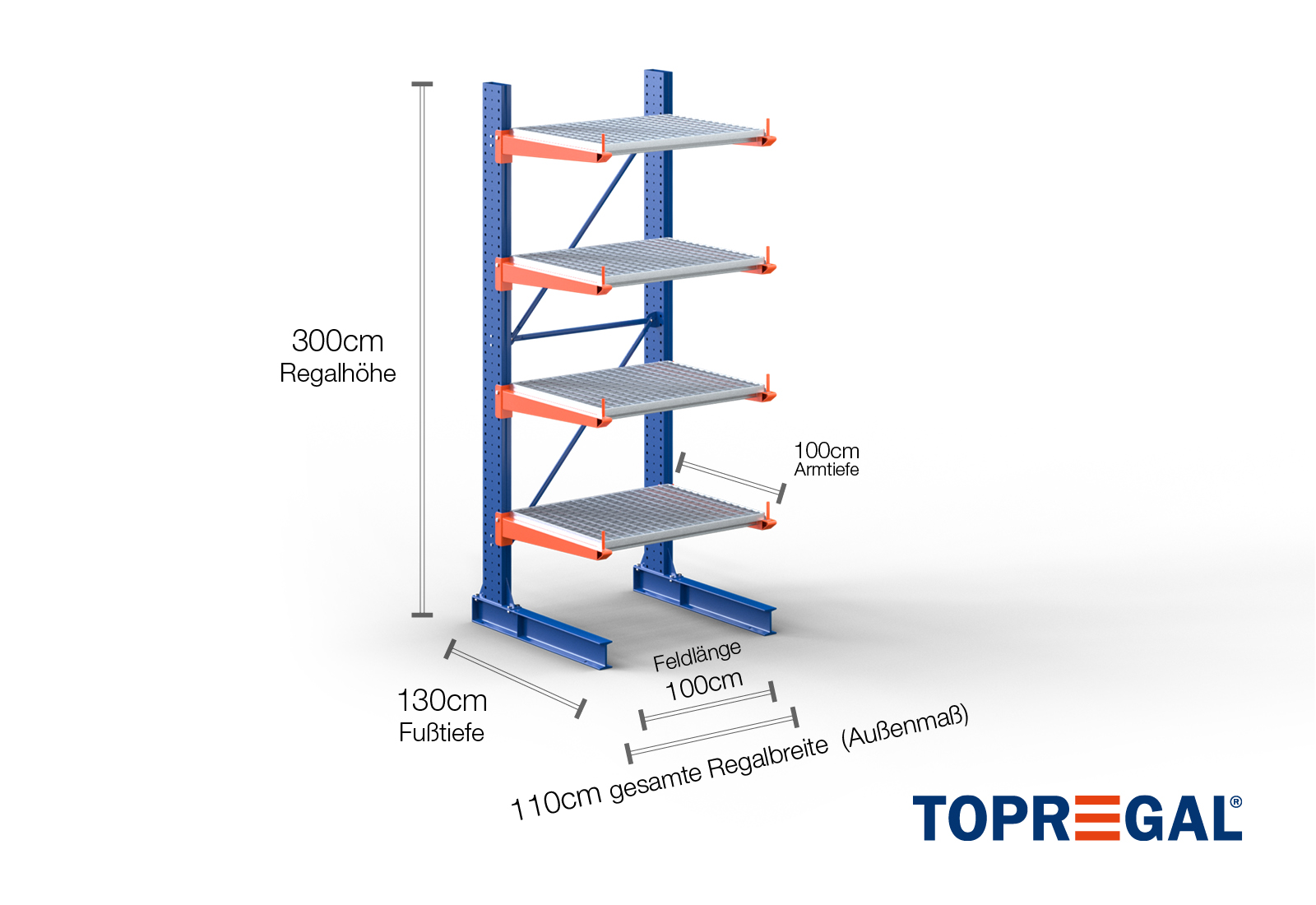 1,1 m cantilever rack KR3000 / Painted / One-sided / 3 m high / 4 levels / 100 cm cantilever depth / rack layer Galvanised mesh