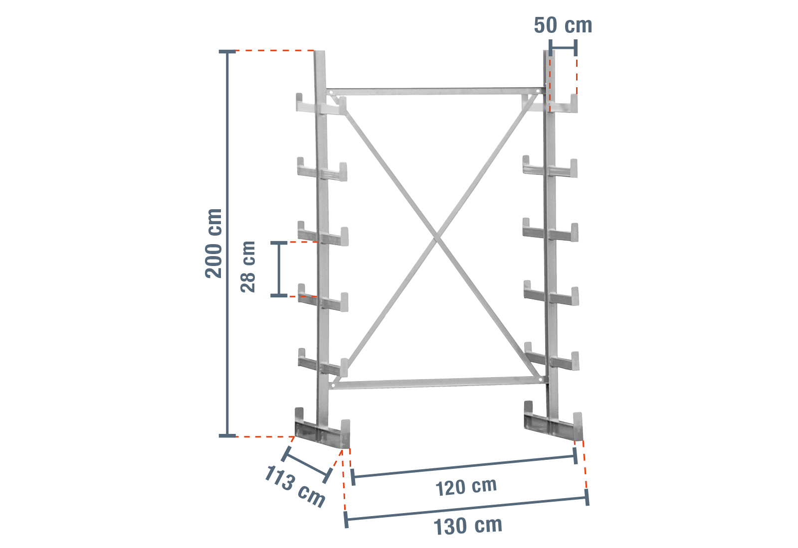 This extra-robust cantilever rack with a width of 1,3 m is 2 m high and has 5 levels with a cantilever depth of 50 cm. Thanks to the double-sided design with welded-on cantilever arms, you can load each upright with a maximum of 2.500 kg, where each cantilever has a maximum load of 250 kg.