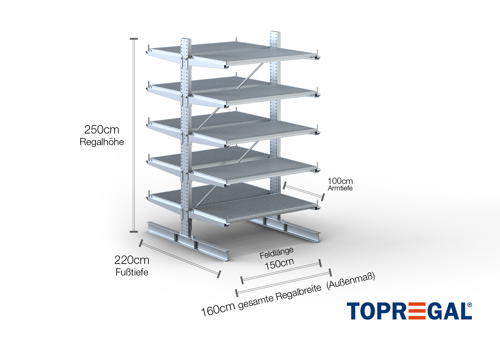 1,6 m cantilever rack KR3000 / Hot-dip galvanised / Double-sided / 2,5 m high / 100 cm cantilever depth / 5 levels / rack layer Galvanised mesh