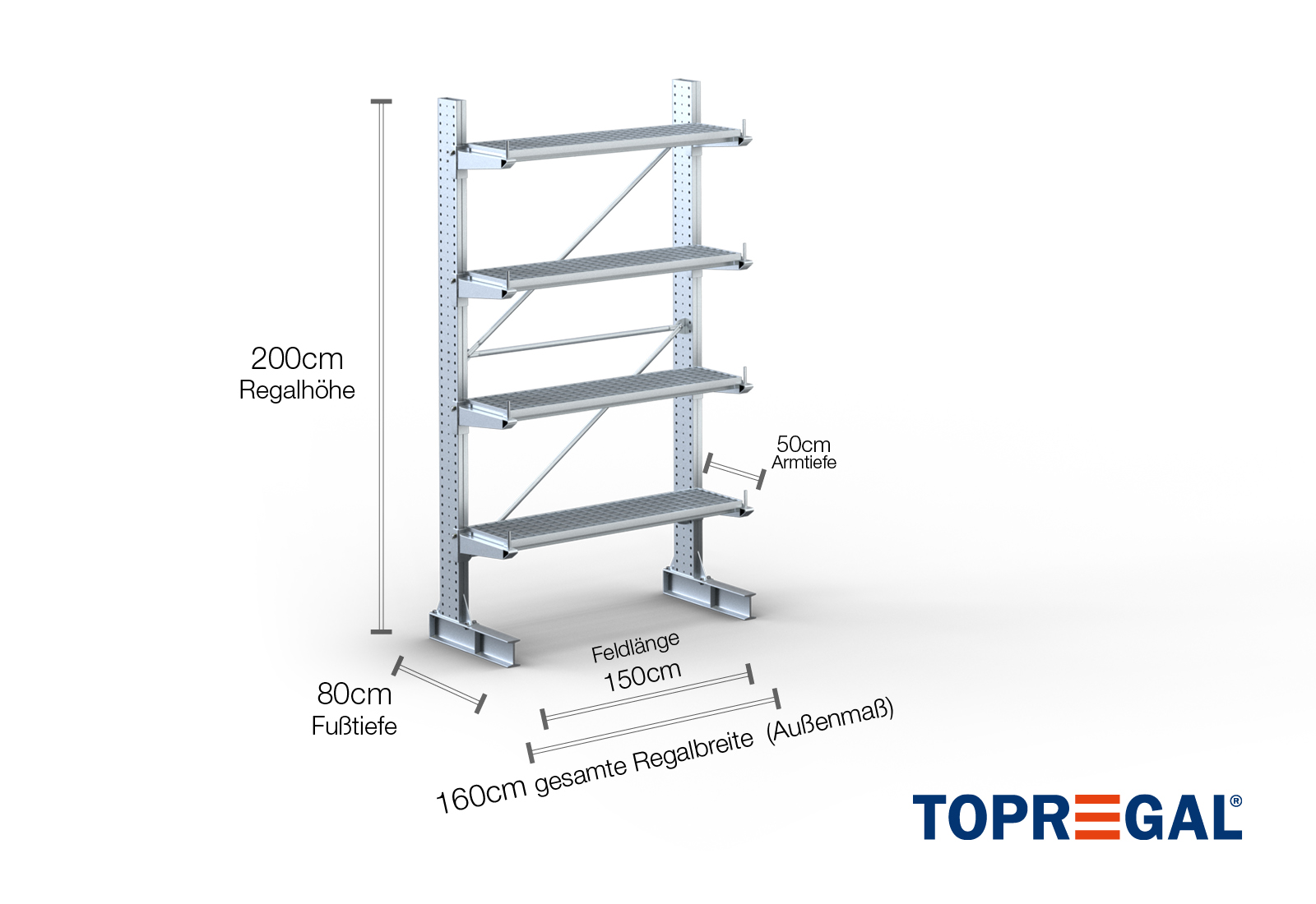 1,6 m cantilever rack KR3000 / Hot-dip galvanised / One-sided / 2 m high / 50 cm cantilever depth / 4 levels / rack layer Galvanised mesh