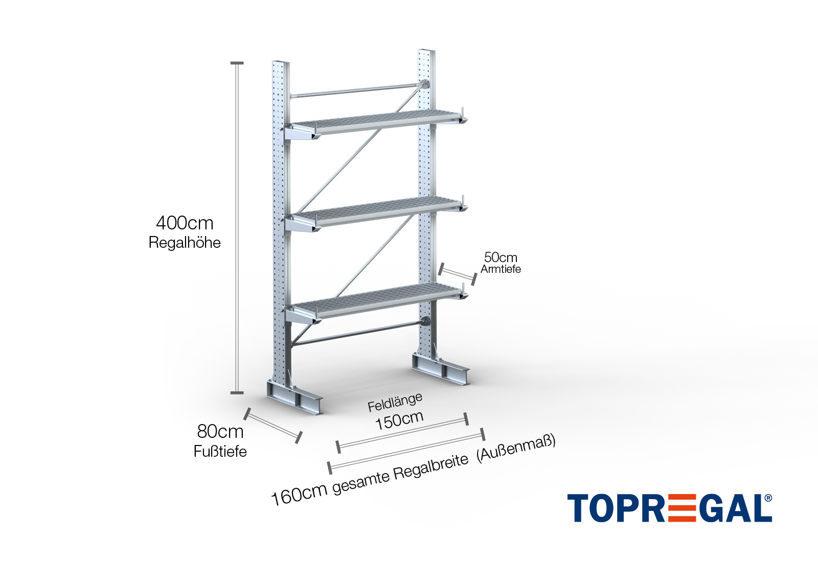 1,6 m cantilever rack KR3000 / Hot-dip galvanised / One-sided / 4 m high / 50 cm cantilever depth / 3 levels / rack layer Galvanised mesh