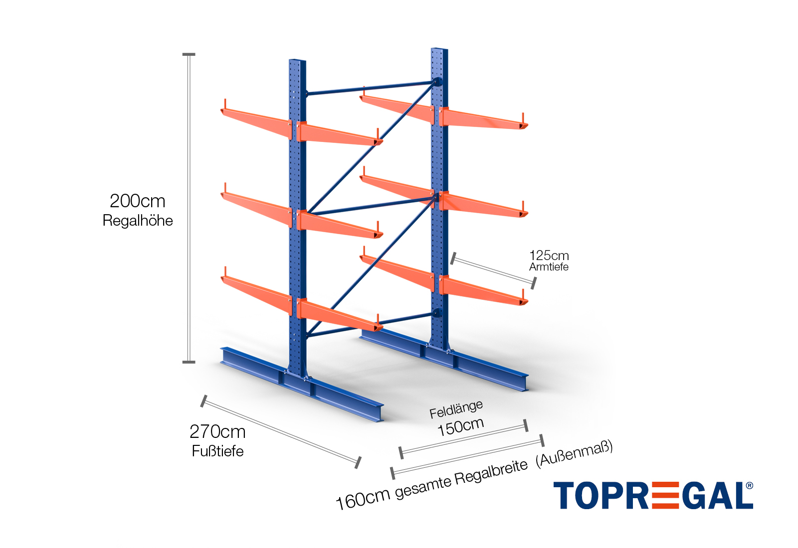 This cantilever rack in a double-sided design with a width of 1,6 m is 2 m high, with an overall depth of 270 cm, and features 3 cantilever levels, with a cantilever depth of 125 cm. The maximum load per cantilever is 500 kg. The cantilevers can be attached at individual heights in increments of 50 mm and are secured with safety bolts and pins. The foot parts can also be used as a storage level (depending on the goods). To protect the load from accidentally slipping, roll-off protection can be attached at the end of each cantilever. This is included as standard in the delivery volume. The maximum unit load capacity (even total load between two uprights) is 3.000 kg.