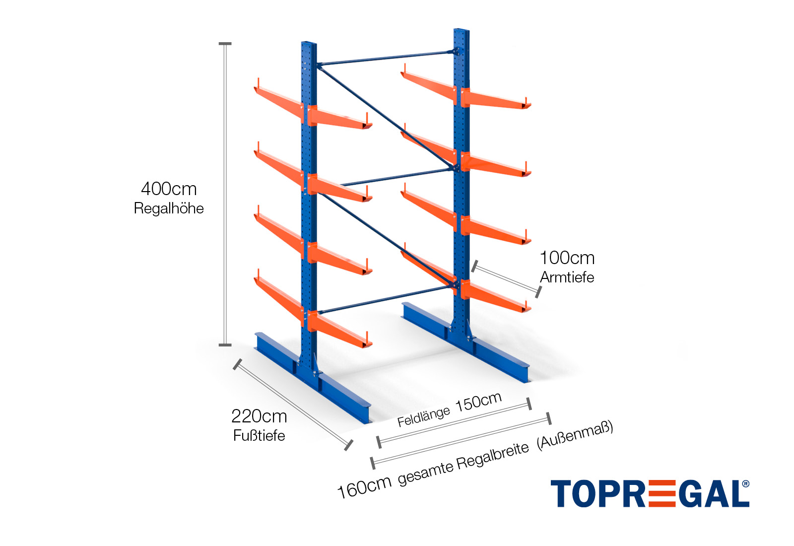 The axial dimension is the internal dimension between two shelf uprights. Depending on the cantilever type, we offer these fields in 120 cm (KR2500) and in 100 cm / 150 cm (KR3000 / KR6000).