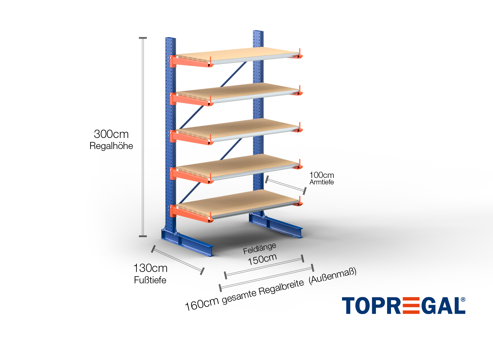 1,6 m cantilever rack KR3000 / Painted / One-sided / 3 m high / 100 cm cantilever depth / 5 levels / rack layer Wood