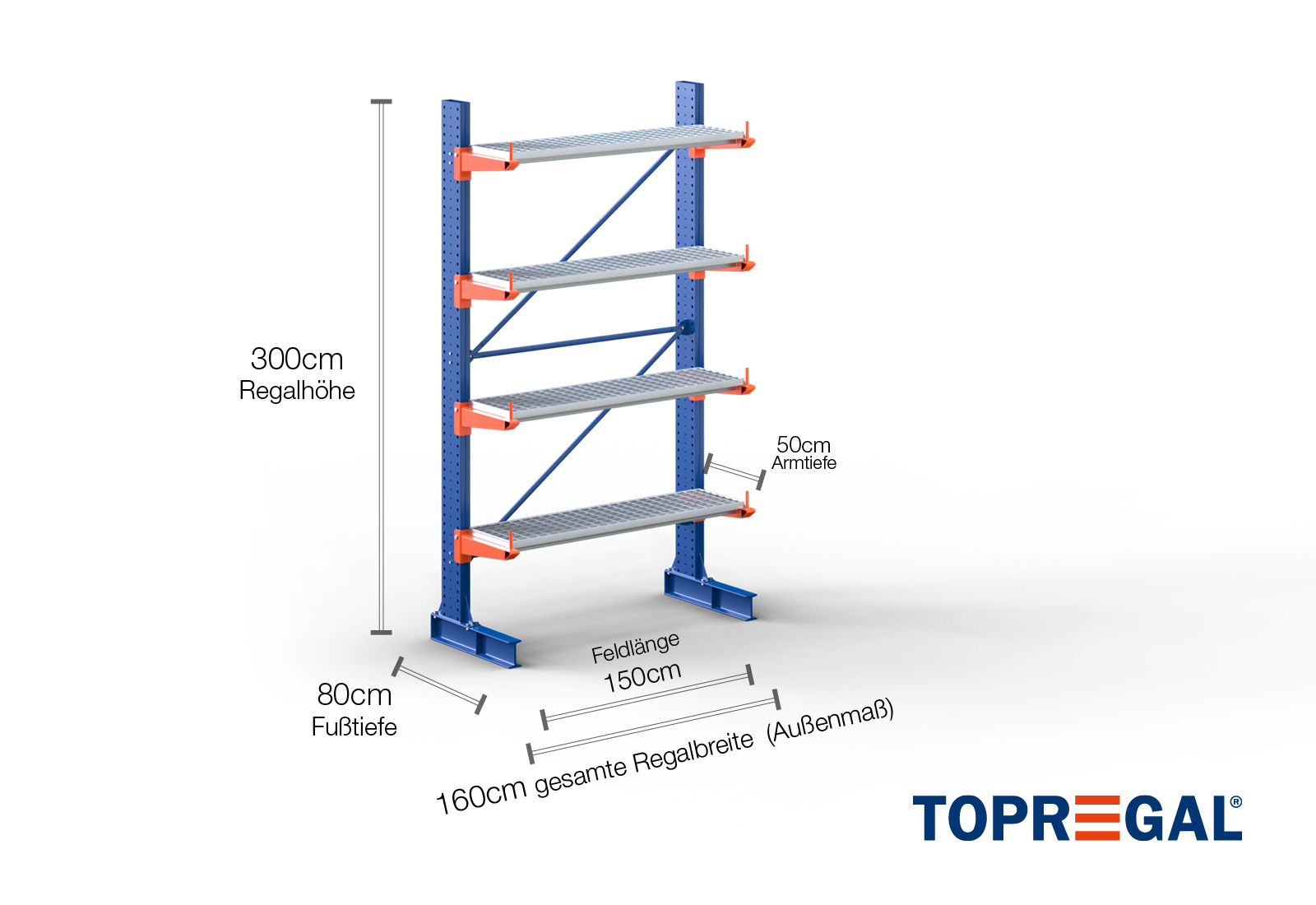 1,6 m cantilever rack KR3000 / Painted / One-sided / 3 m high / 4 levels / 50 cm cantilever depth / rack layer Galvanised mesh