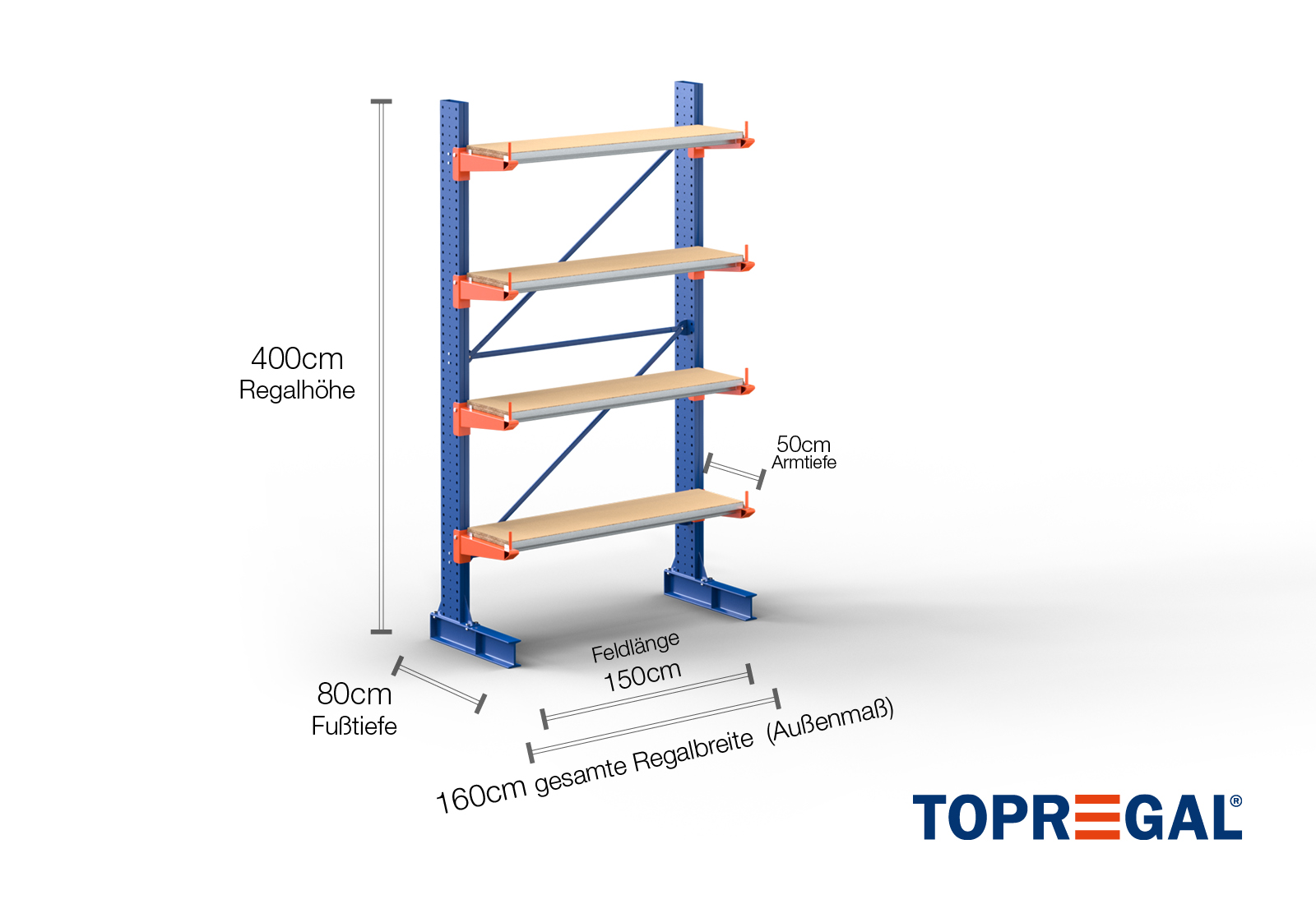 1,6 m cantilever rack KR3000 / Painted / One-sided / 4 m high / 50 cm cantilever depth / 4 levels / rack layer Wood