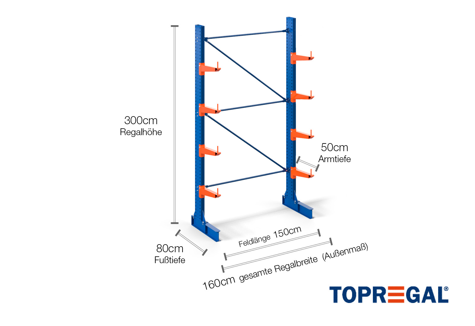 1,6 m cantilever rack KR3000 / Painted / One-sided / 50 cm cantilever depth / 3 m high / 4 levels