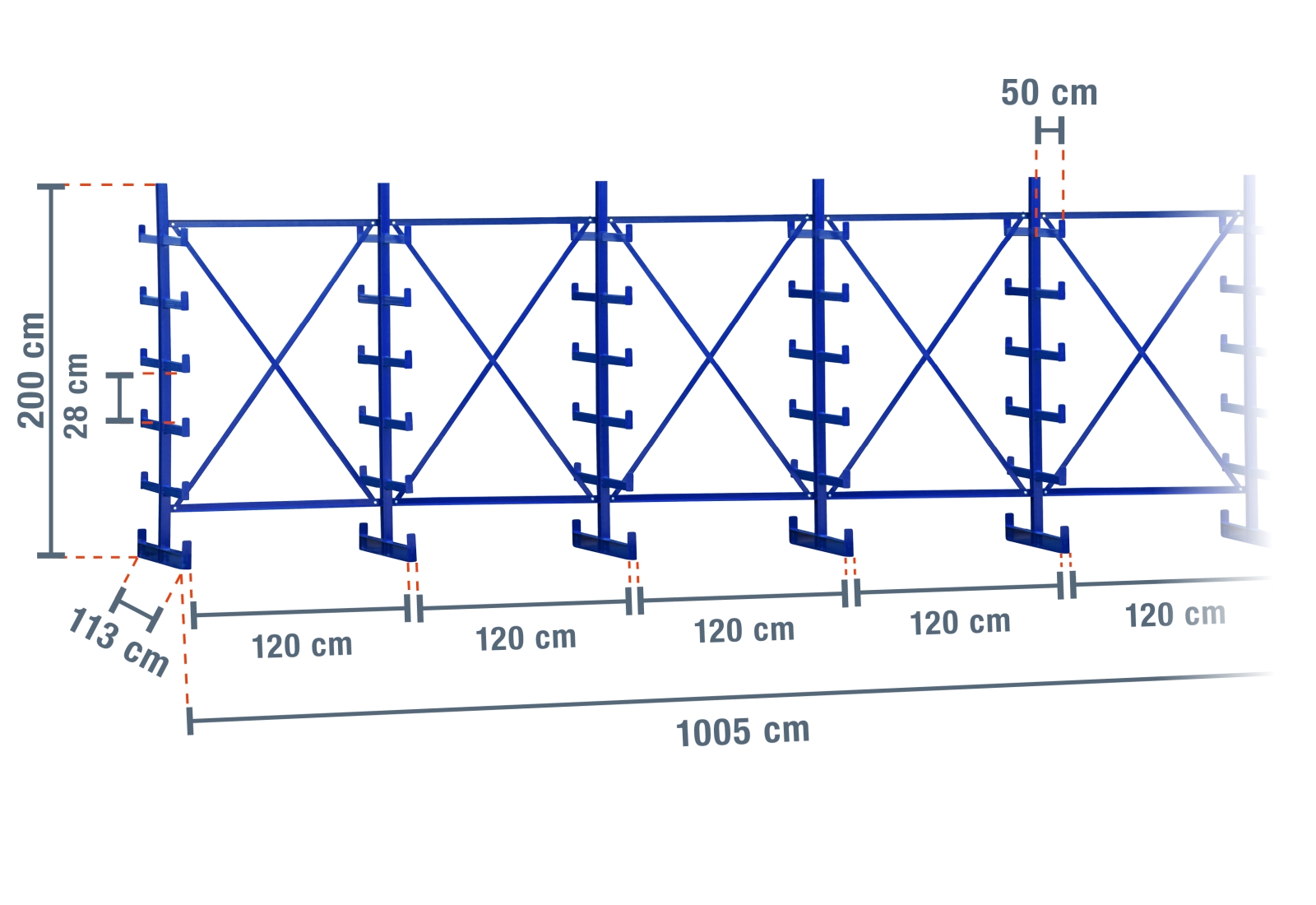 This extra-robust cantilever rack with a width of 10,05 m is 2 m high and has 5 levels with a cantilever depth of 50 cm. Thanks to the double-sided design with welded-on cantilever arms, you can load each upright with a maximum of 2.500 kg, where each cantilever has a maximum load of 250 kg.