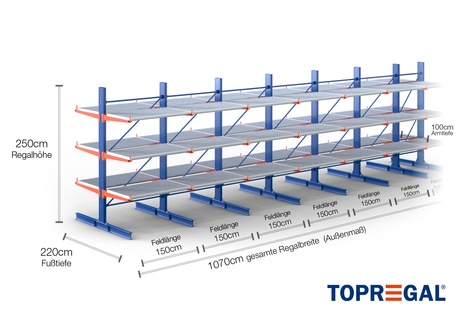 This cantilever rack in a double-sided design with a width of 10,7 m is 2,5 m high, with an overall depth of 220 cm, and features 3 cantilever levels, with a cantilever depth of 100 cm. The maximum load per cantilever is 500 kg. The cantilevers can be attached at individual heights in increments of 50 mm and are secured with safety bolts and pins. The foot parts can also be used as a storage level (depending on the goods). To protect the load from accidentally slipping, roll-off protection can be attached at the end of each cantilever. This is included as standard in the delivery volume. The maximum unit load capacity (even total load between two uprights) is 3.000 kg.