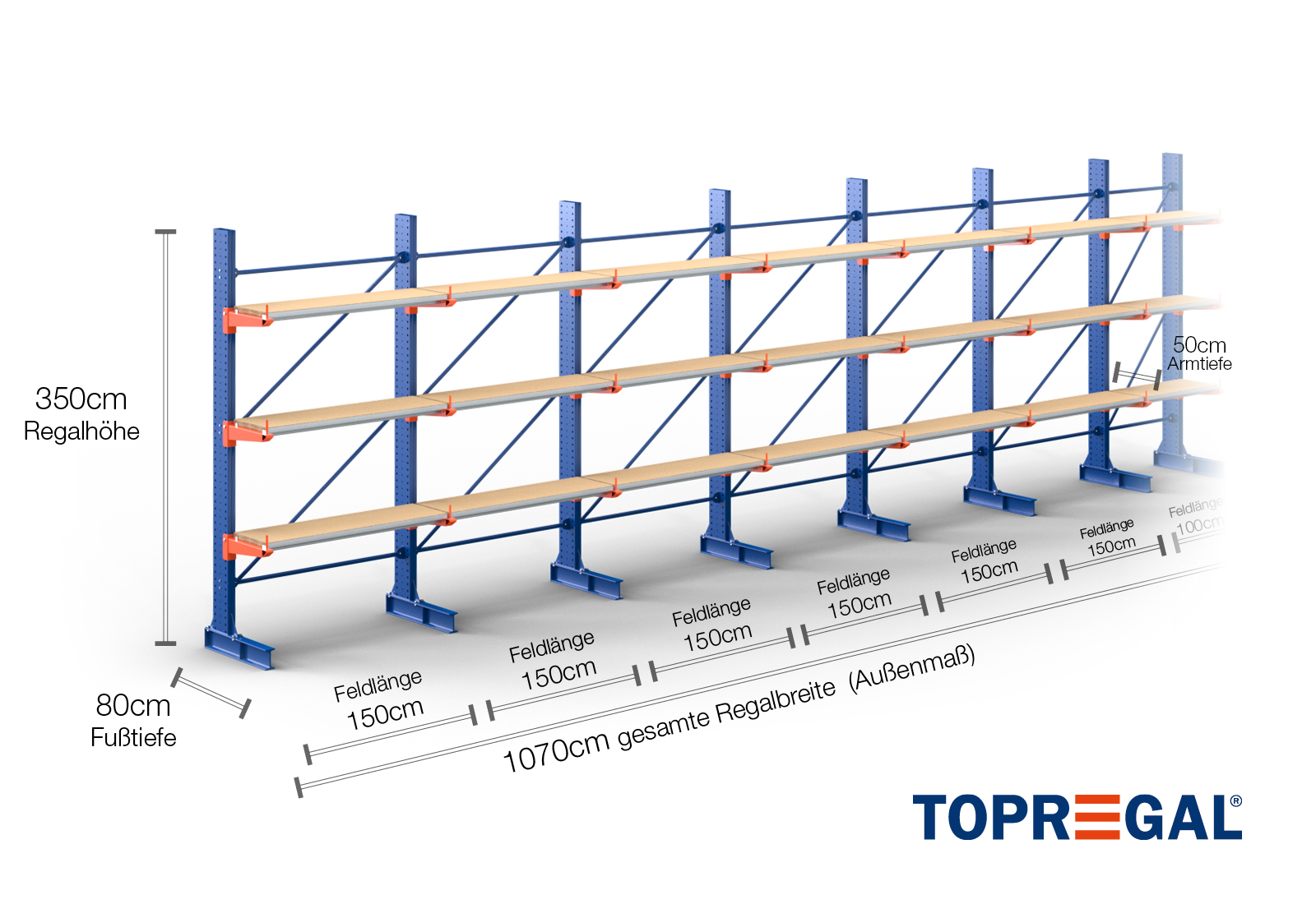 The axial dimension is the internal dimension between two shelf uprights. Depending on the cantilever type, we offer these fields in 120 cm (KR2500) and in 100 cm / 150 cm (KR3000 / KR6000).