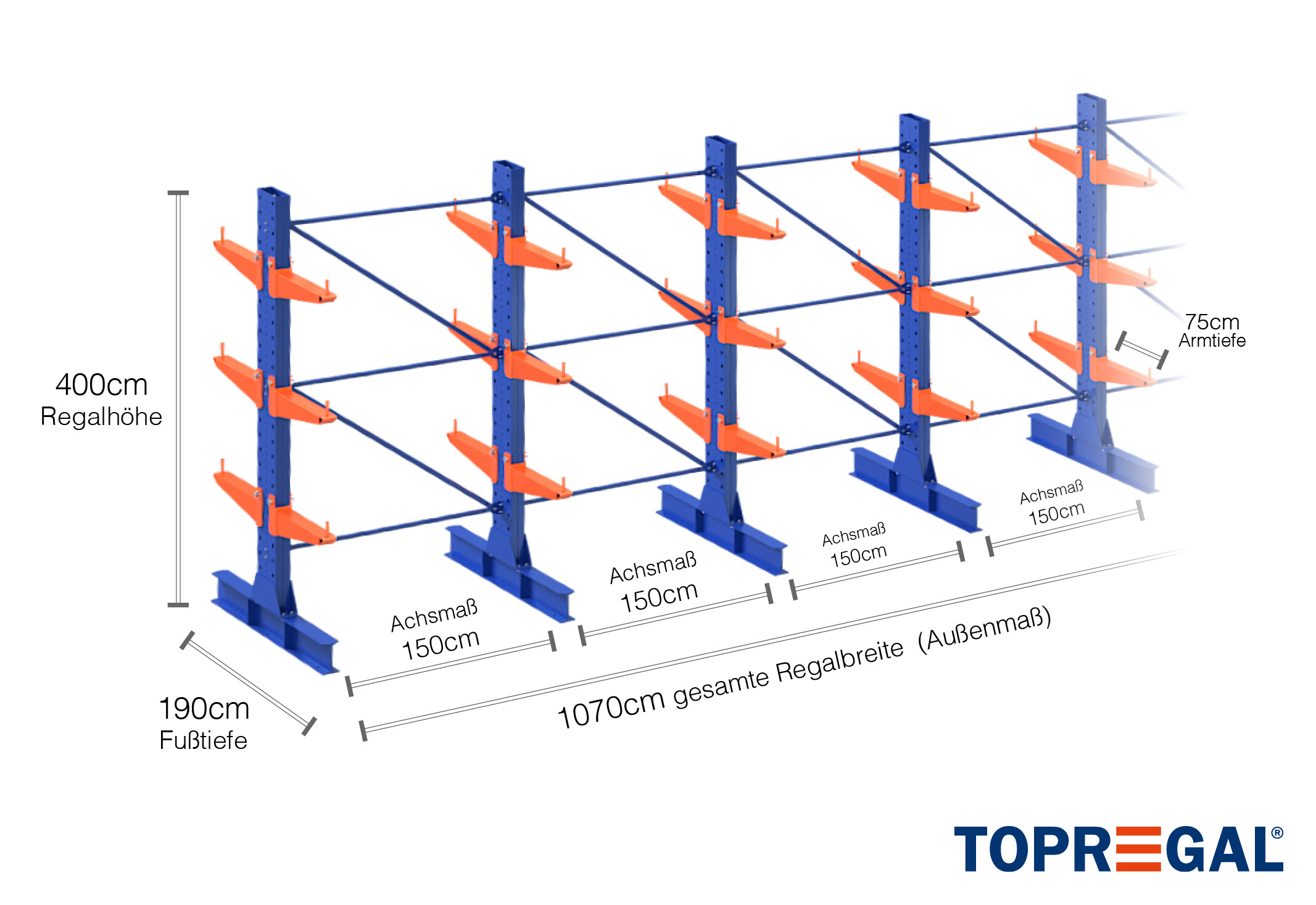 The axial dimension is the internal dimension between two shelf uprights. Depending on the cantilever type, we offer these fields in 120 cm (KR2500) and in 100 cm / 150 cm (KR3000 / KR6000).