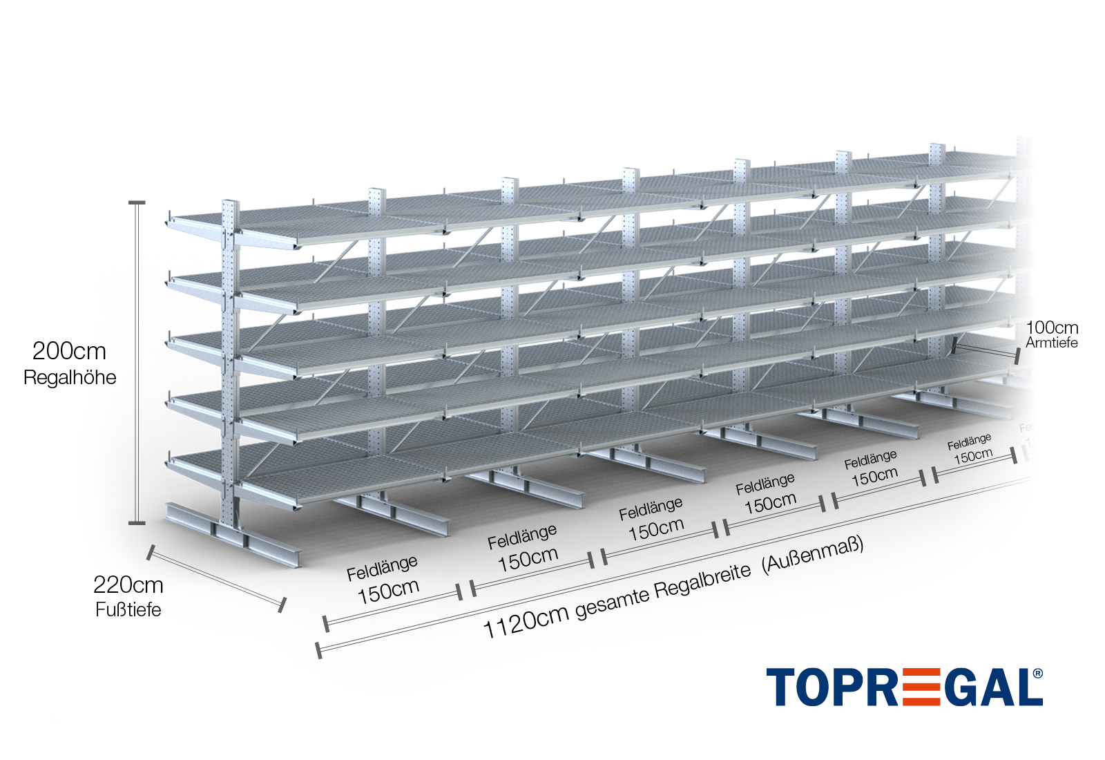 The axial dimension is the internal dimension between two shelf uprights. Depending on the cantilever type, we offer these fields in 120 cm (KR2500) and in 100 cm / 150 cm (KR3000 / KR6000).