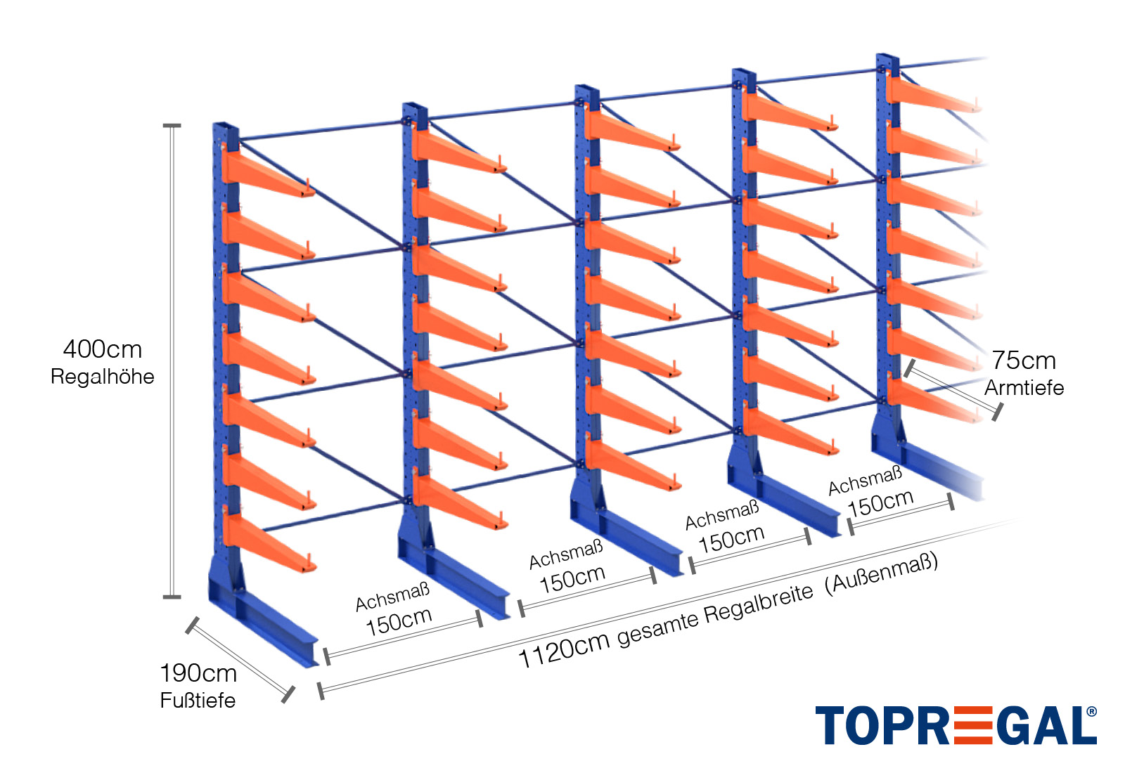 The axial dimension is the internal dimension between two shelf uprights. Depending on the cantilever type, we offer these fields in 120 cm (KR2500) and in 100 cm / 150 cm (KR3000 / KR6000).