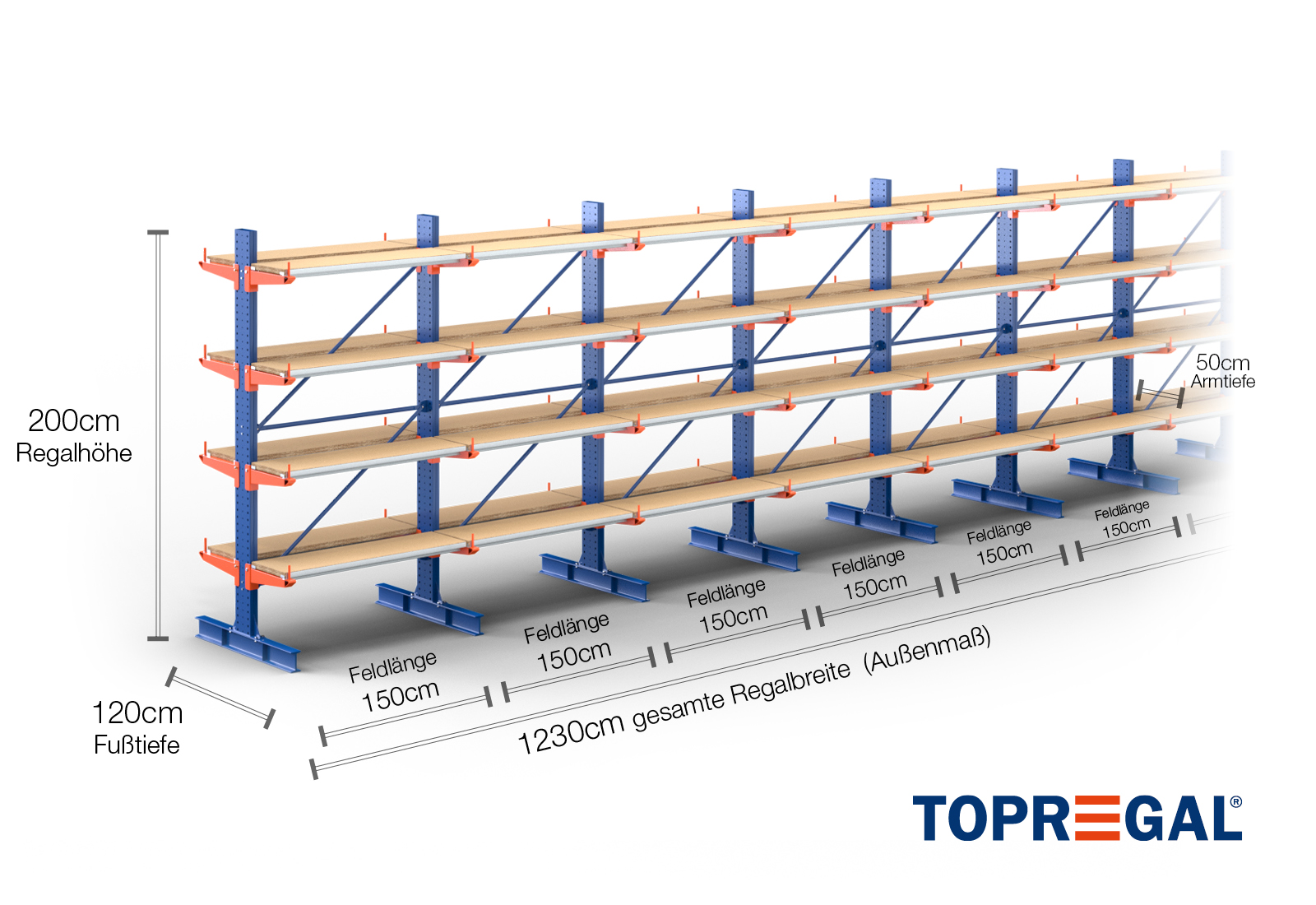 The axial dimension is the internal dimension between two shelf uprights. Depending on the cantilever type, we offer these fields in 120 cm (KR2500) and in 100 cm / 150 cm (KR3000 / KR6000).
