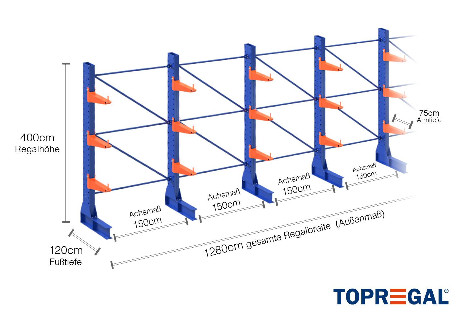 The axial dimension is the internal dimension between two shelf uprights. Depending on the cantilever type, we offer these fields in 120 cm (KR2500) and in 100 cm / 150 cm (KR3000 / KR6000).