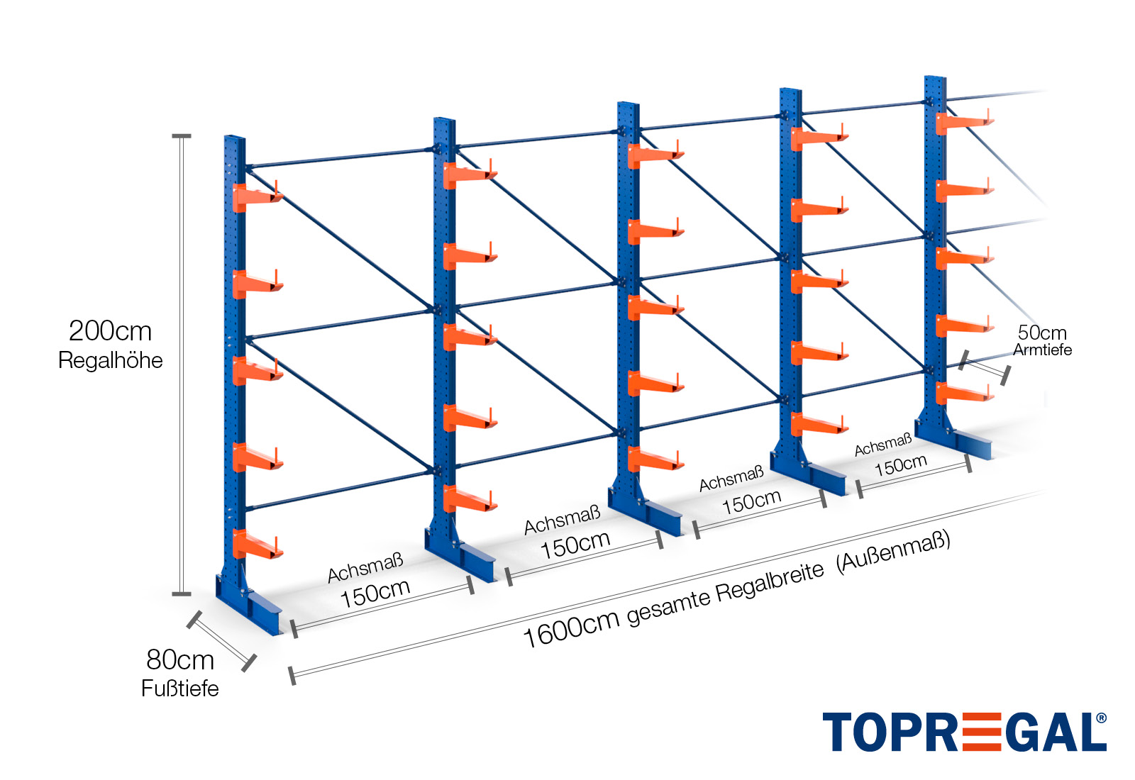 The axial dimension is the internal dimension between two shelf uprights. Depending on the cantilever type, we offer these fields in 120 cm (KR2500) and in 100 cm / 150 cm (KR3000 / KR6000).