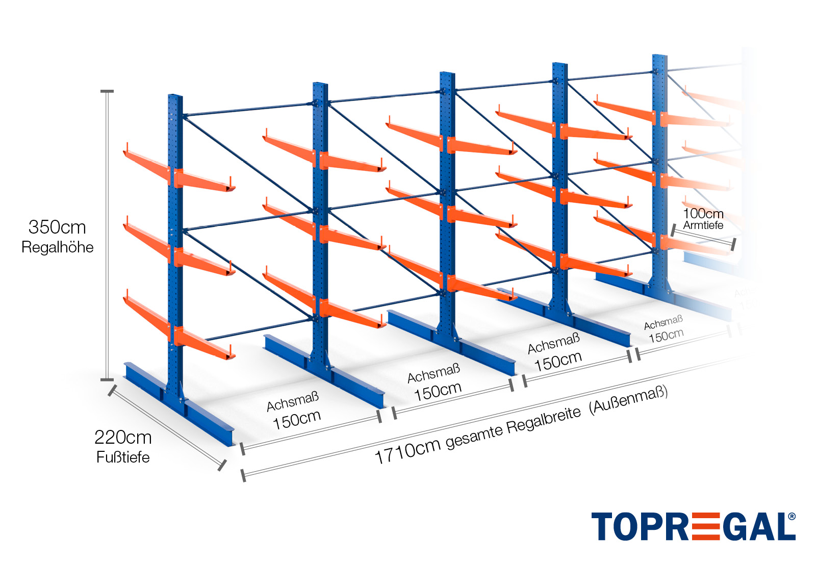 The axial dimension is the internal dimension between two shelf uprights. Depending on the cantilever type, we offer these fields in 120 cm (KR2500) and in 100 cm / 150 cm (KR3000 / KR6000).
