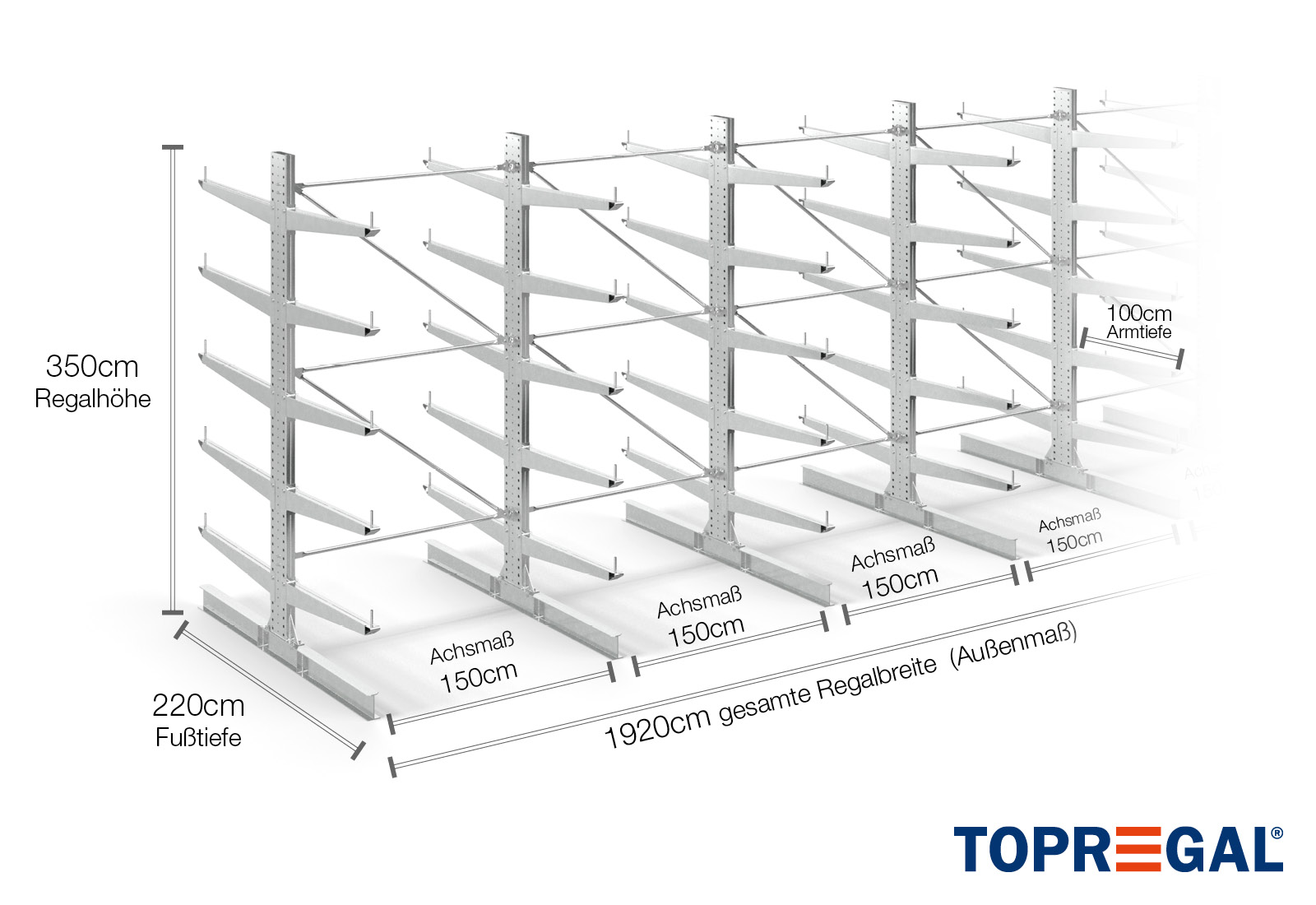 The axial dimension is the internal dimension between two shelf uprights. Depending on the cantilever type, we offer these fields in 120 cm (KR2500) and in 100 cm / 150 cm (KR3000 / KR6000).