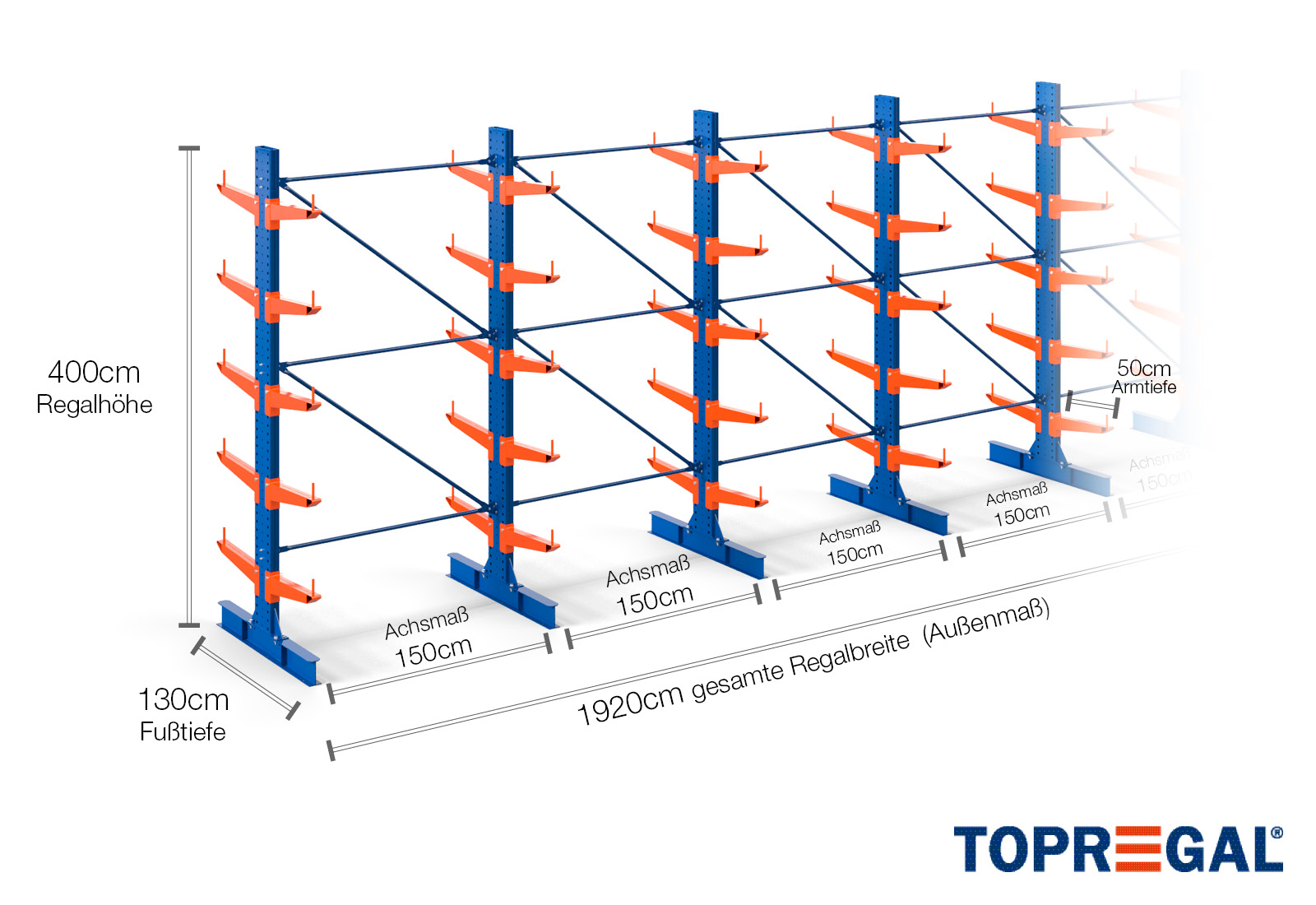 The axial dimension is the internal dimension between two shelf uprights. Depending on the cantilever type, we offer these fields in 120 cm (KR2500) and in 100 cm / 150 cm (KR3000 / KR6000).