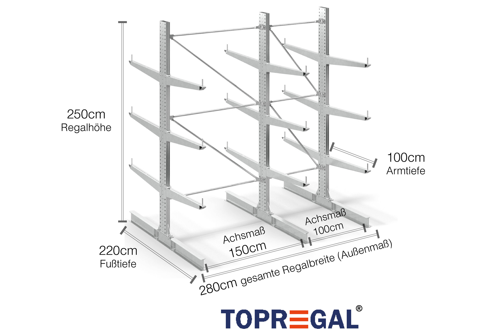 The axial dimension is the internal dimension between two shelf uprights. Depending on the cantilever type, we offer these fields in 120 cm (KR2500) and in 100 cm / 150 cm (KR3000 / KR6000).