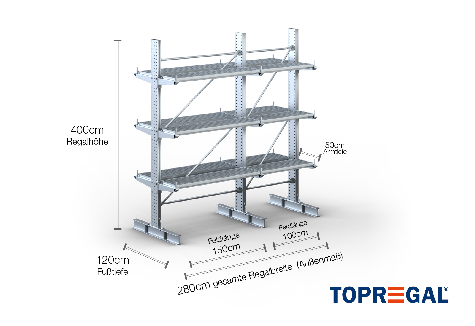 2,8 m cantilever rack KR3000 / Hot-dip galvanised / Double-sided / 4 m high / 50 cm cantilever depth / 3 levels / rack layer Galvanised mesh