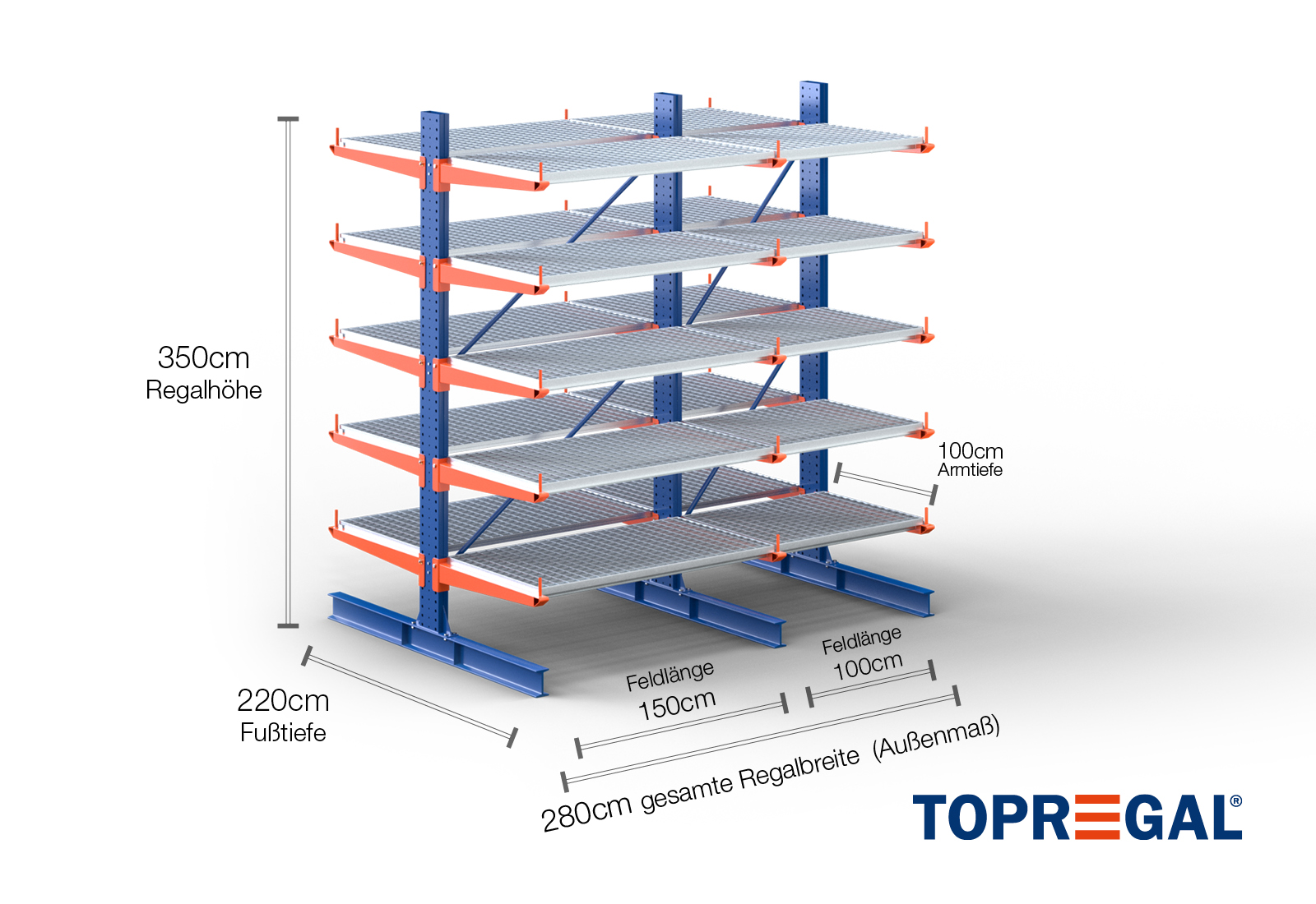 2,8 m cantilever rack KR3000 / Painted / Double-sided / 3,5 m high / 100 cm cantilever depth / 5 levels / rack layer Galvanised mesh