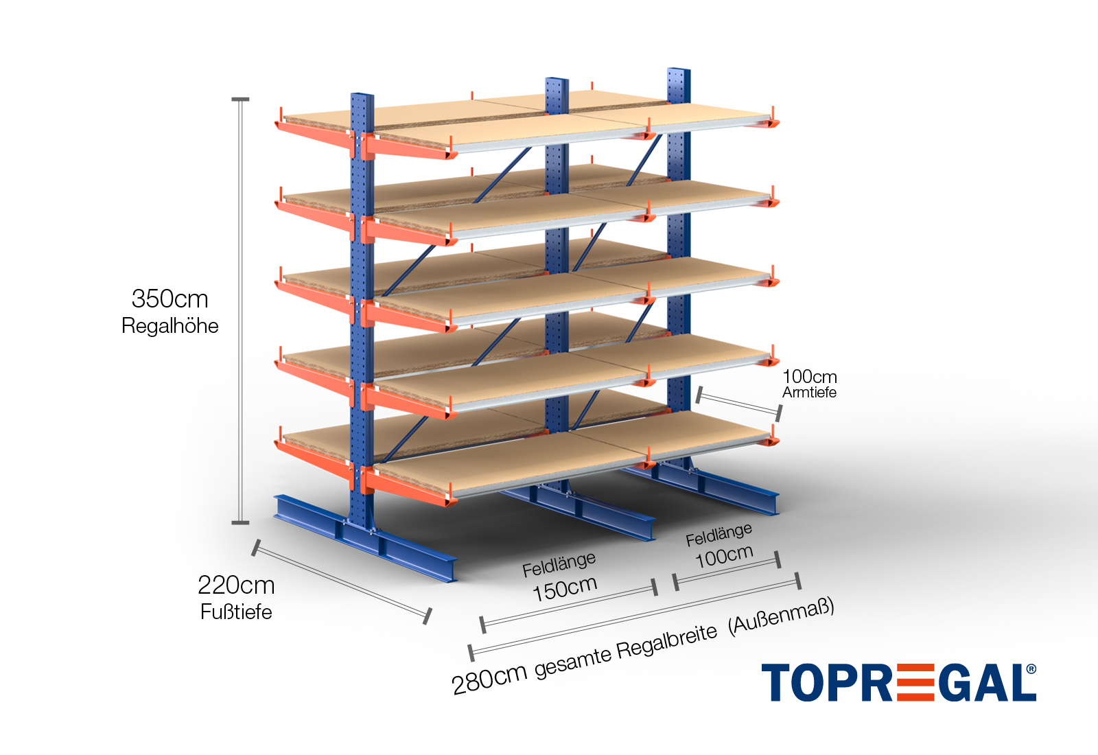 2,8 m cantilever rack KR3000 / Painted / Double-sided / 3,5 m high / 100 cm cantilever depth / 5 levels / rack layer Wood