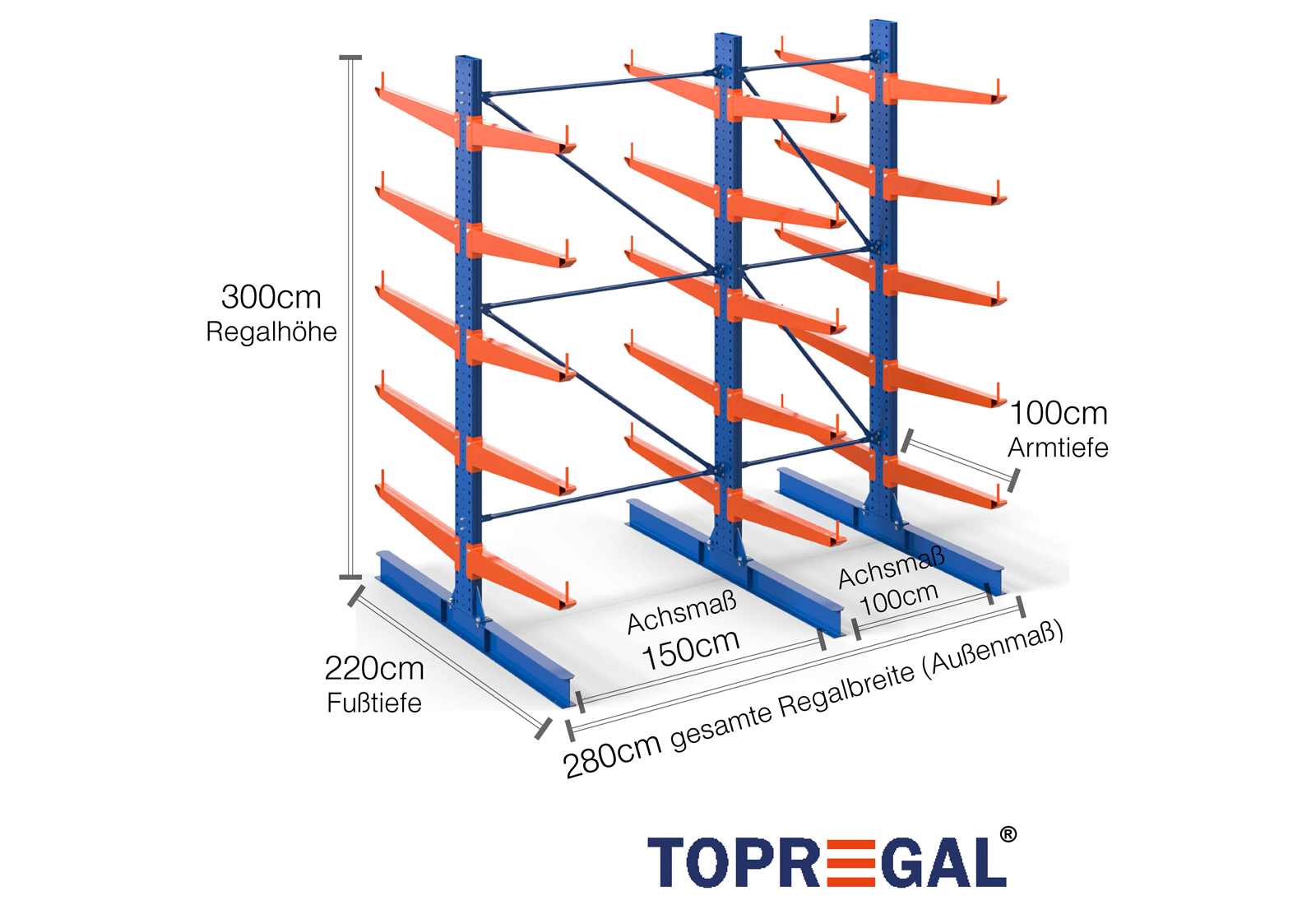 2,8 m cantilever rack KR3000 / Painted / Double-sided / 3 m high / 100 cm cantilever depth / 5 levels