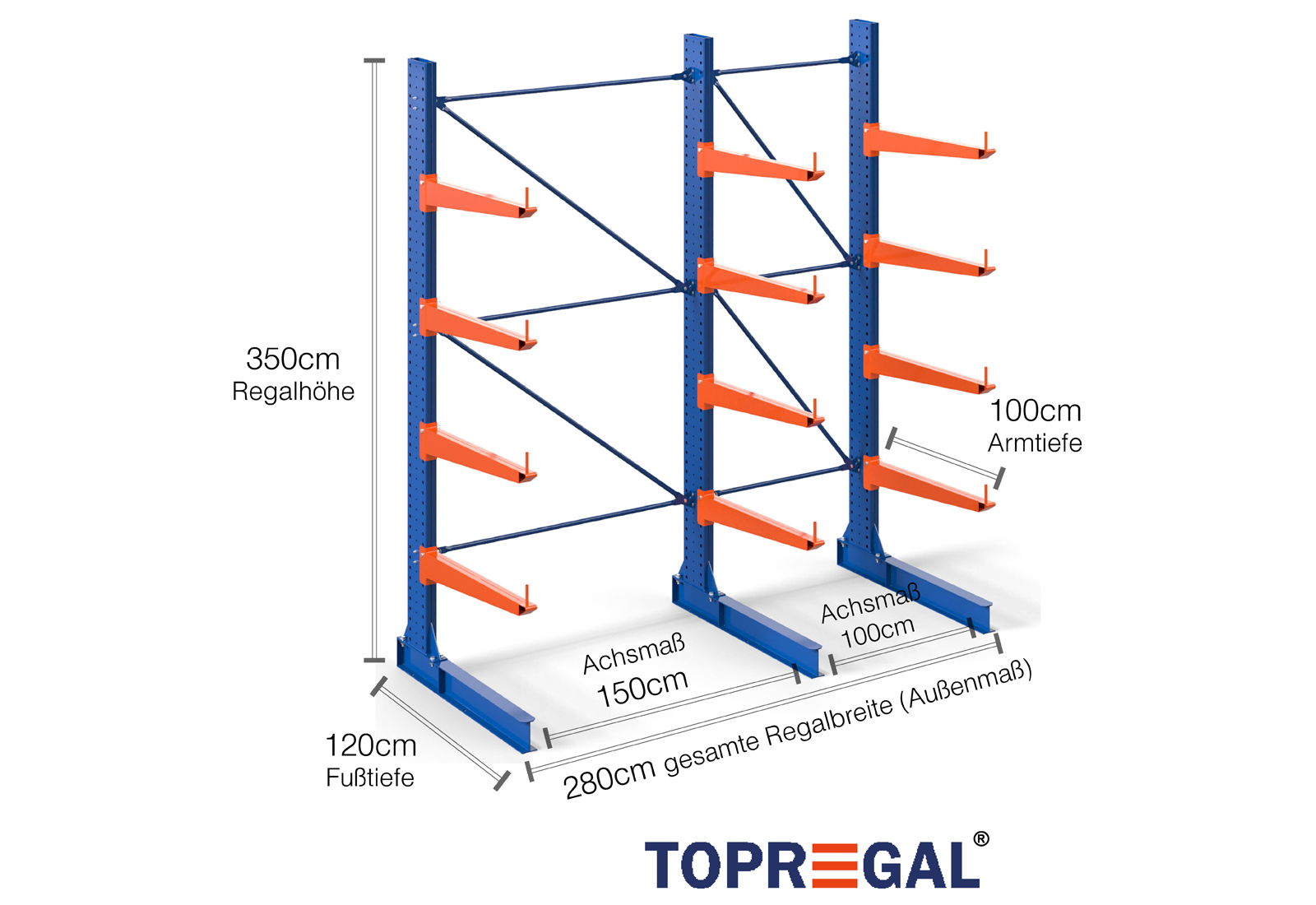 The axial dimension is the internal dimension between two shelf uprights. Depending on the cantilever type, we offer these fields in 120 cm (KR2500) and in 100 cm / 150 cm (KR3000 / KR6000).