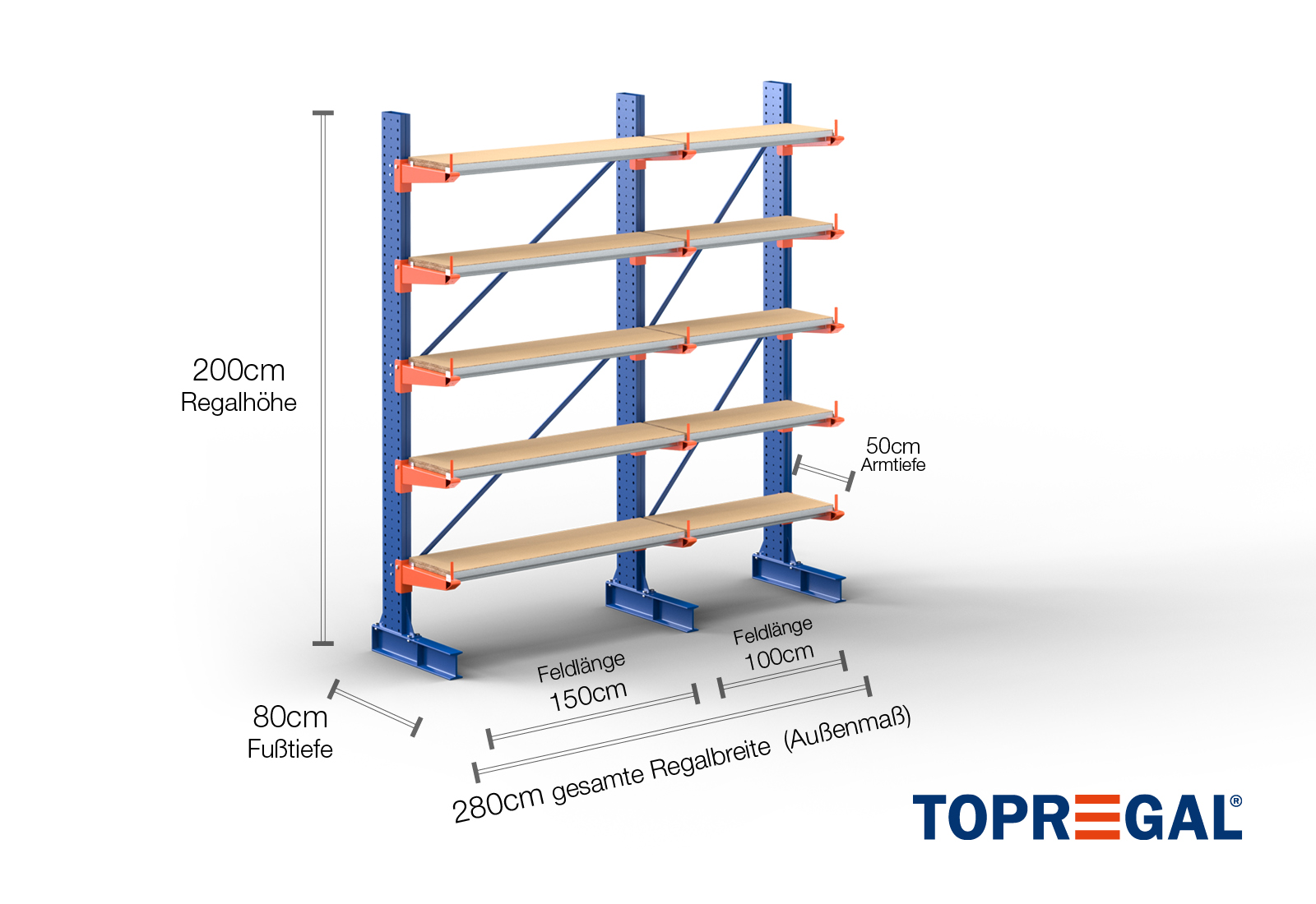 2,8 m cantilever rack KR3000 / Painted / One-sided / 2 m high / 50 cm cantilever depth / 5 levels / rack layer Wood