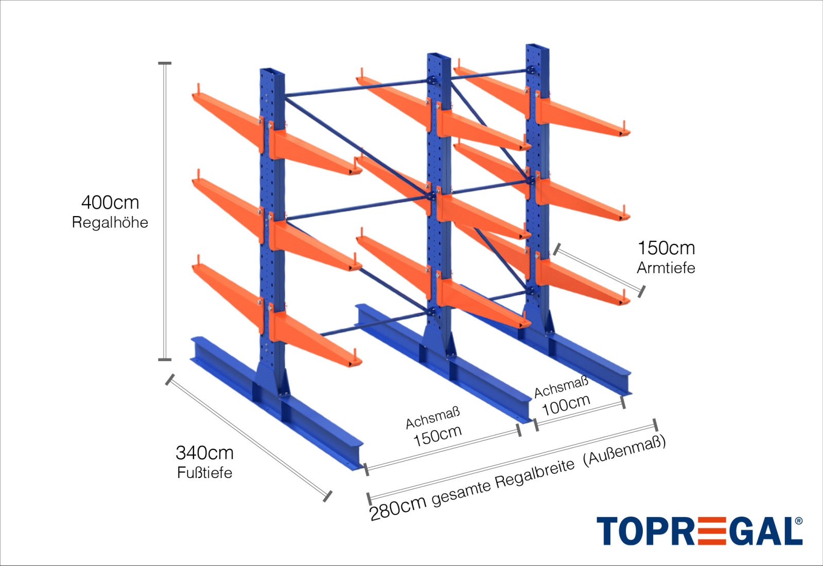 The axial dimension is the internal dimension between two shelf uprights. Depending on the cantilever type, we offer these fields in 120 cm (KR2500) and in 100 cm / 150 cm (KR3000 / KR6000).