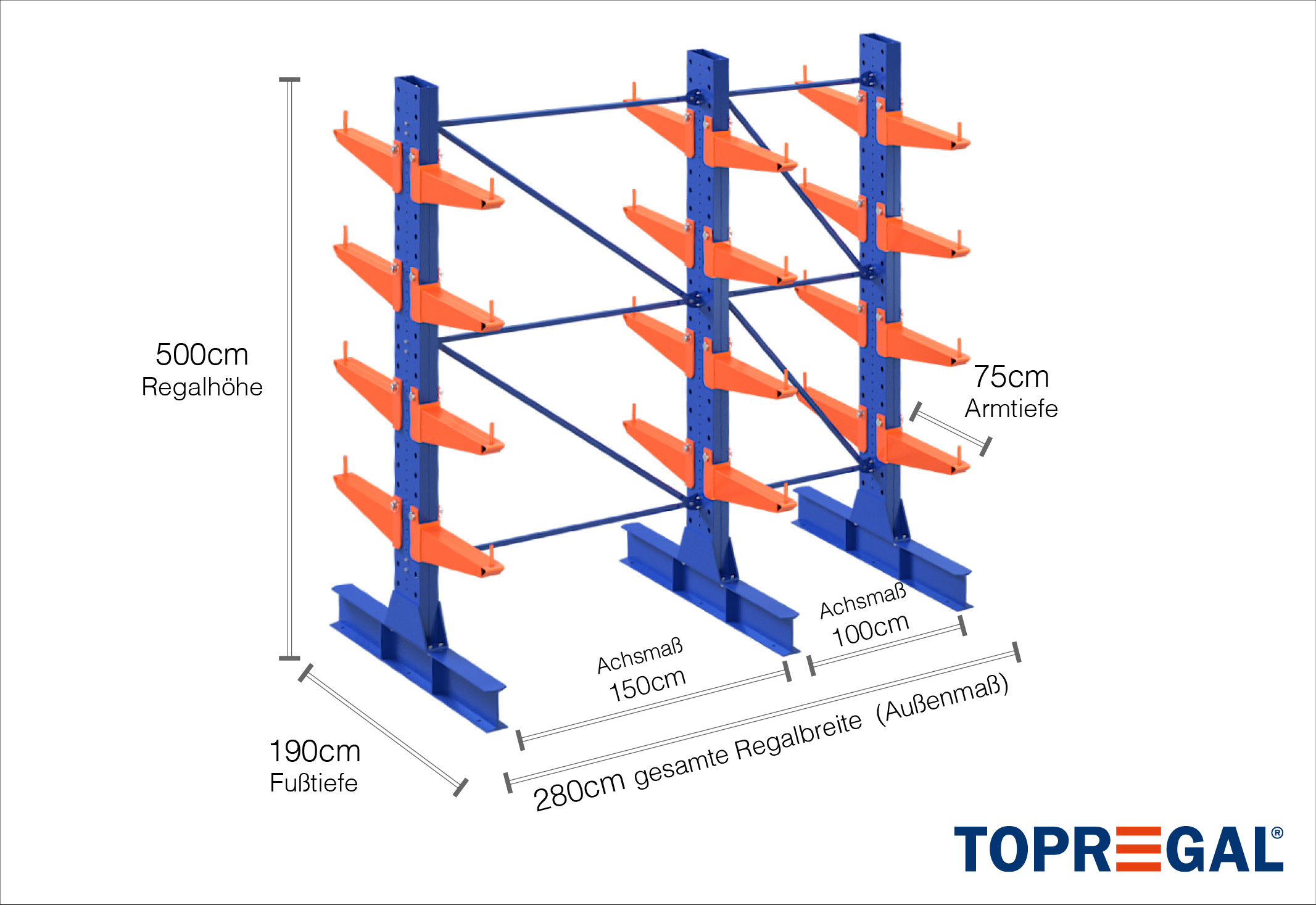 The axial dimension is the internal dimension between two shelf uprights. Depending on the cantilever type, we offer these fields in 120 cm (KR2500) and in 100 cm / 150 cm (KR3000 / KR6000).