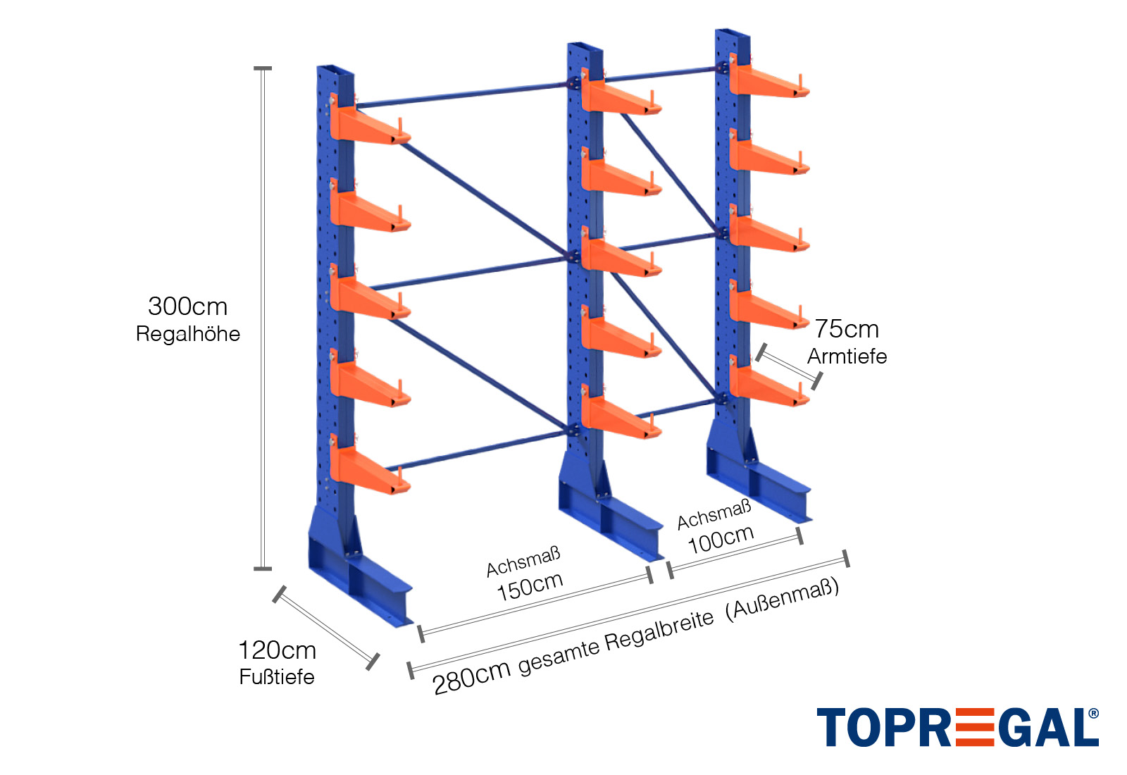 The axial dimension is the internal dimension between two shelf uprights. Depending on the cantilever type, we offer these fields in 120 cm (KR2500) and in 100 cm / 150 cm (KR3000 / KR6000).