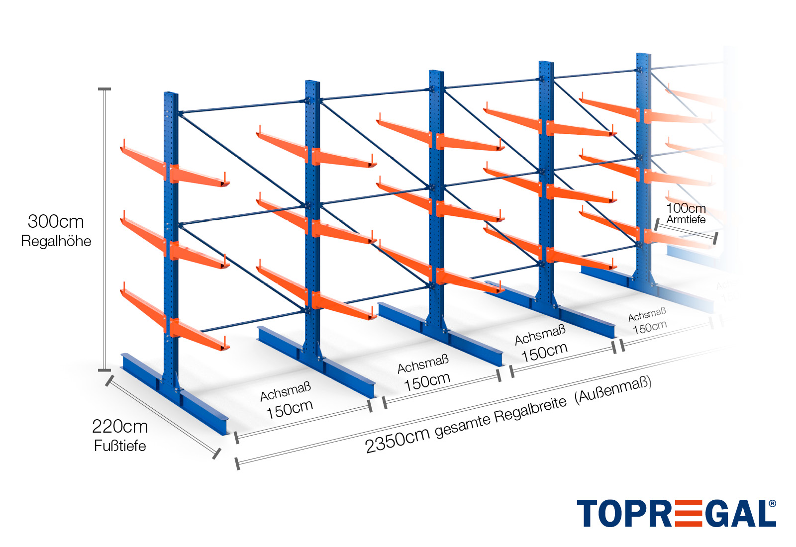 The axial dimension is the internal dimension between two shelf uprights. Depending on the cantilever type, we offer these fields in 120 cm (KR2500) and in 100 cm / 150 cm (KR3000 / KR6000).