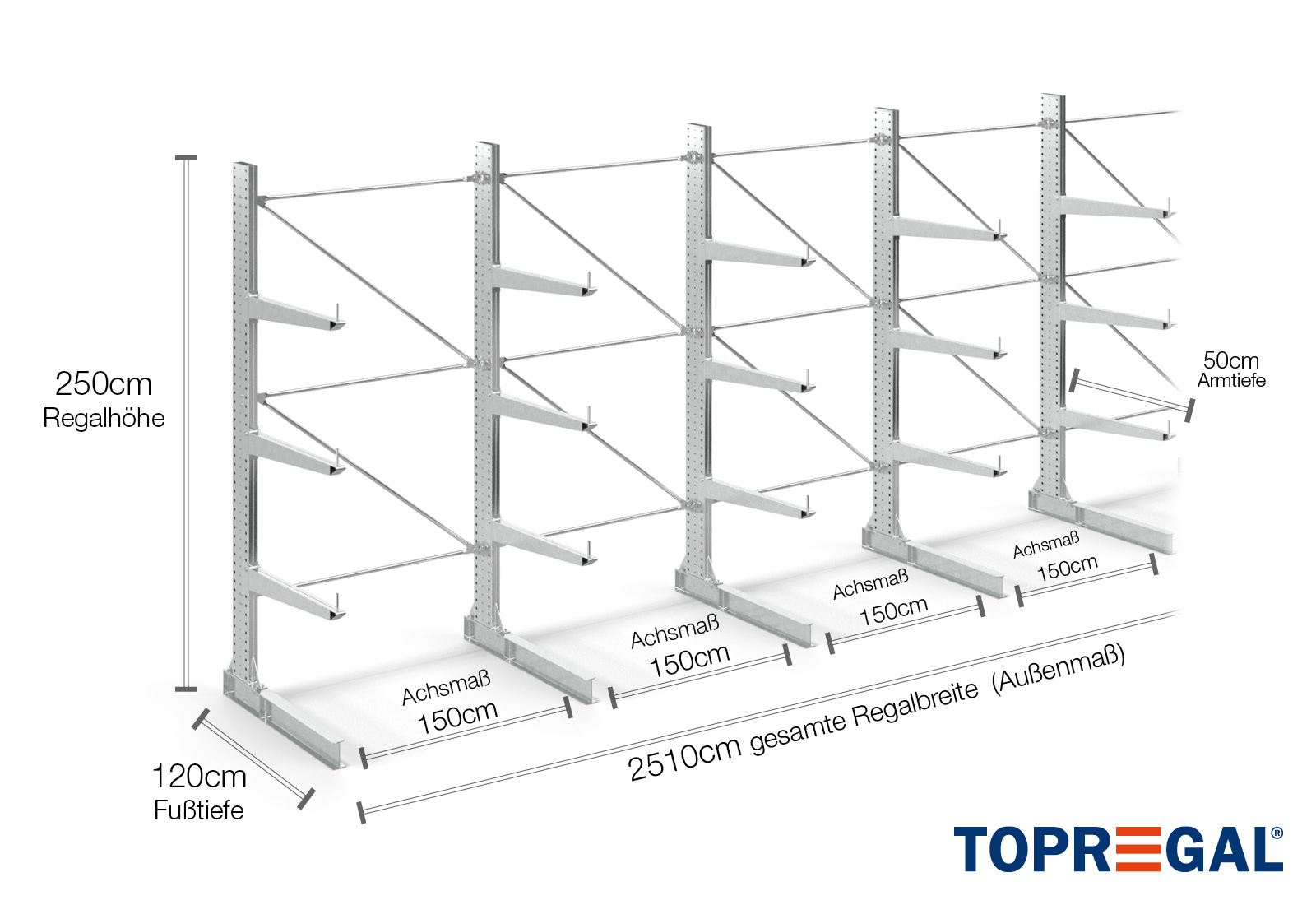 The axial dimension is the internal dimension between two shelf uprights. Depending on the cantilever type, we offer these fields in 120 cm (KR2500) and in 100 cm / 150 cm (KR3000 / KR6000).