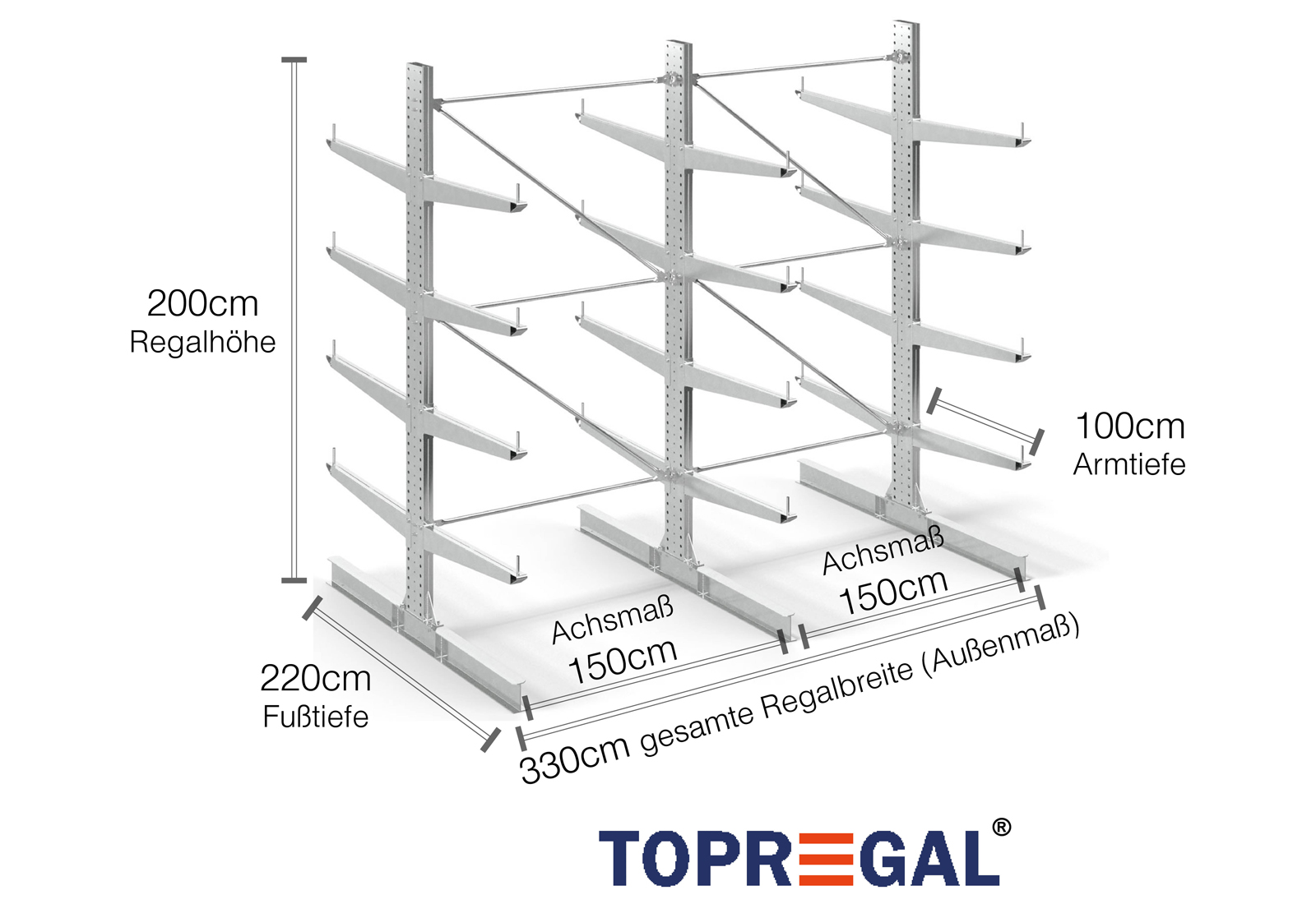 The axial dimension is the internal dimension between two shelf uprights. Depending on the cantilever type, we offer these fields in 120 cm (KR2500) and in 100 cm / 150 cm (KR3000 / KR6000).