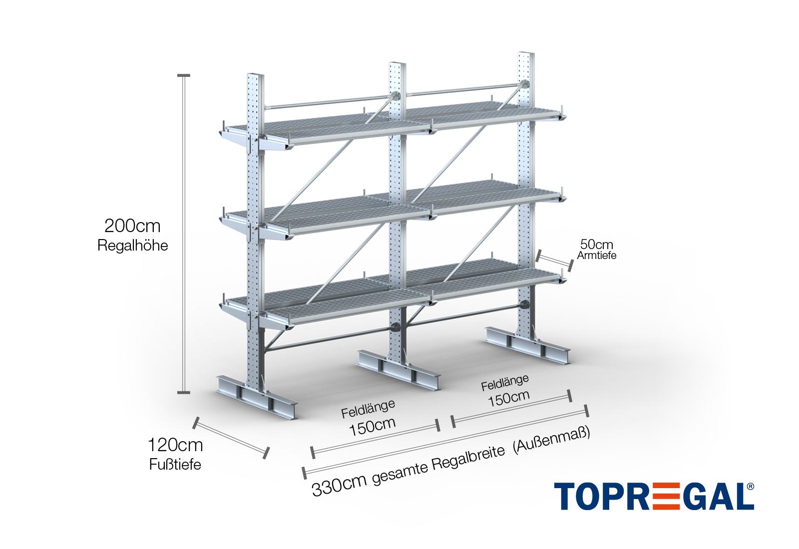3,3 m cantilever rack KR3000 / Hot-dip galvanised / Double-sided / 2 m high / 50 cm cantilever depth / 3 levels / rack layer Galvanised mesh