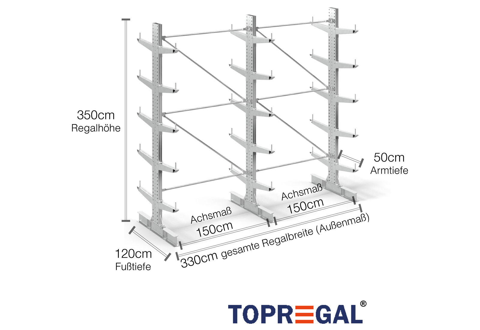 The axial dimension is the internal dimension between two shelf uprights. Depending on the cantilever type, we offer these fields in 120 cm (KR2500) and in 100 cm / 150 cm (KR3000 / KR6000).