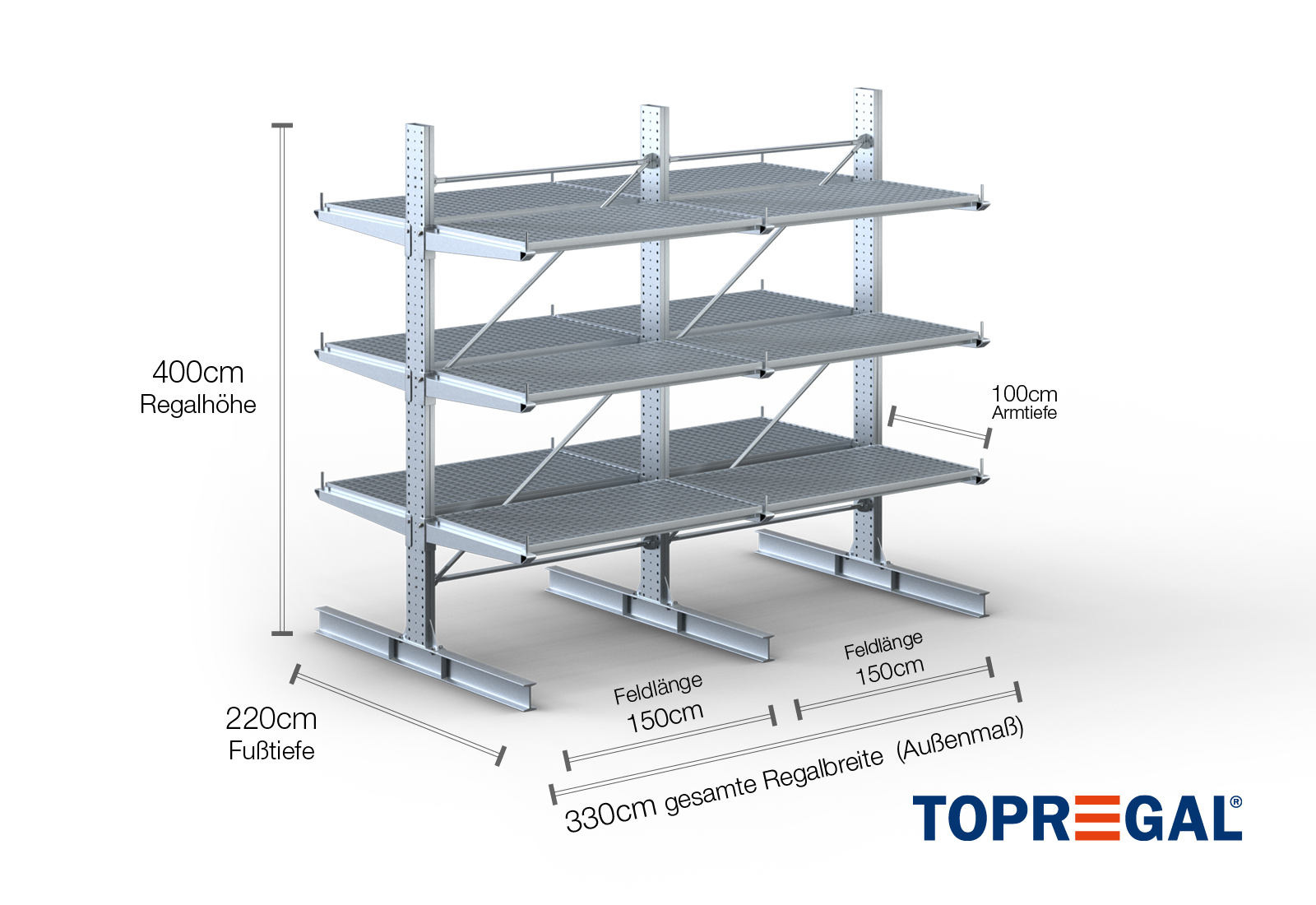 3,3 m cantilever rack KR3000 / Hot-dip galvanised / Double-sided / 4 m high / 100 cm cantilever depth / 3 levels / rack layer Galvanised mesh