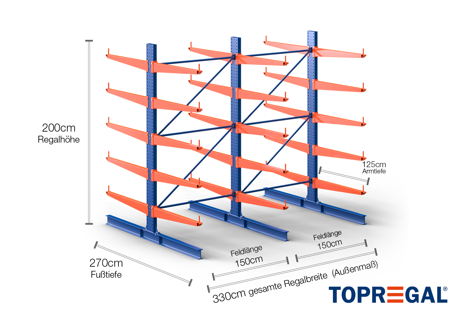 3,3 m cantilever rack KR3000 / Painted / Double-sided / 2 m high / 125 cm cantilever depth / 5 levels