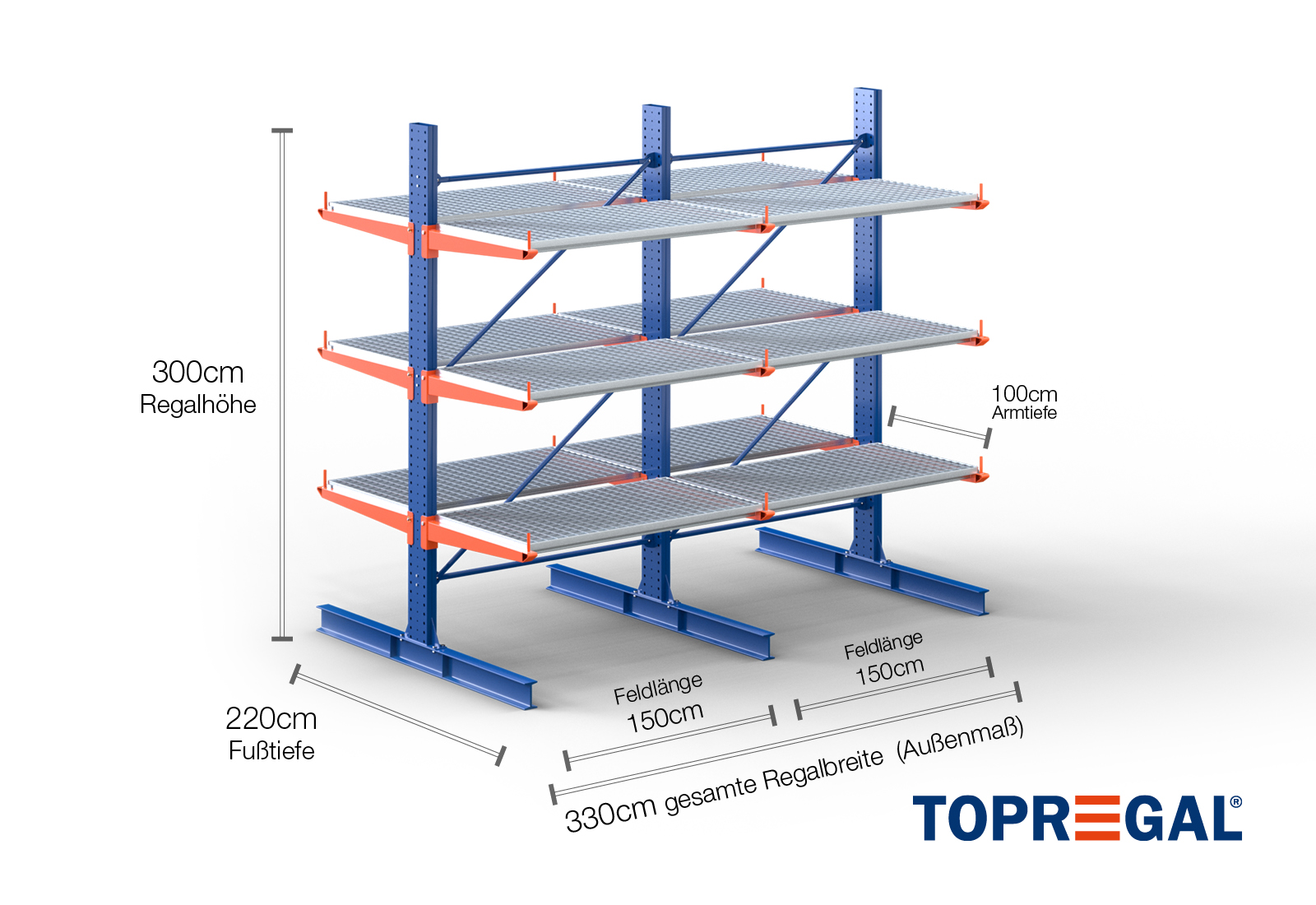 This cantilever rack in a double-sided design with a width of 3,3 m is 3 m high, with an overall depth of 220 cm, and features 3 cantilever levels, with a cantilever depth of 100 cm. The maximum load per cantilever is 500 kg. The cantilevers can be attached at individual heights in increments of 50 mm and are secured with safety bolts and pins. The foot parts can also be used as a storage level (depending on the goods). To protect the load from accidentally slipping, roll-off protection can be attached at the end of each cantilever. This is included as standard in the delivery volume. The maximum unit load capacity (even total load between two uprights) is 3.000 kg.