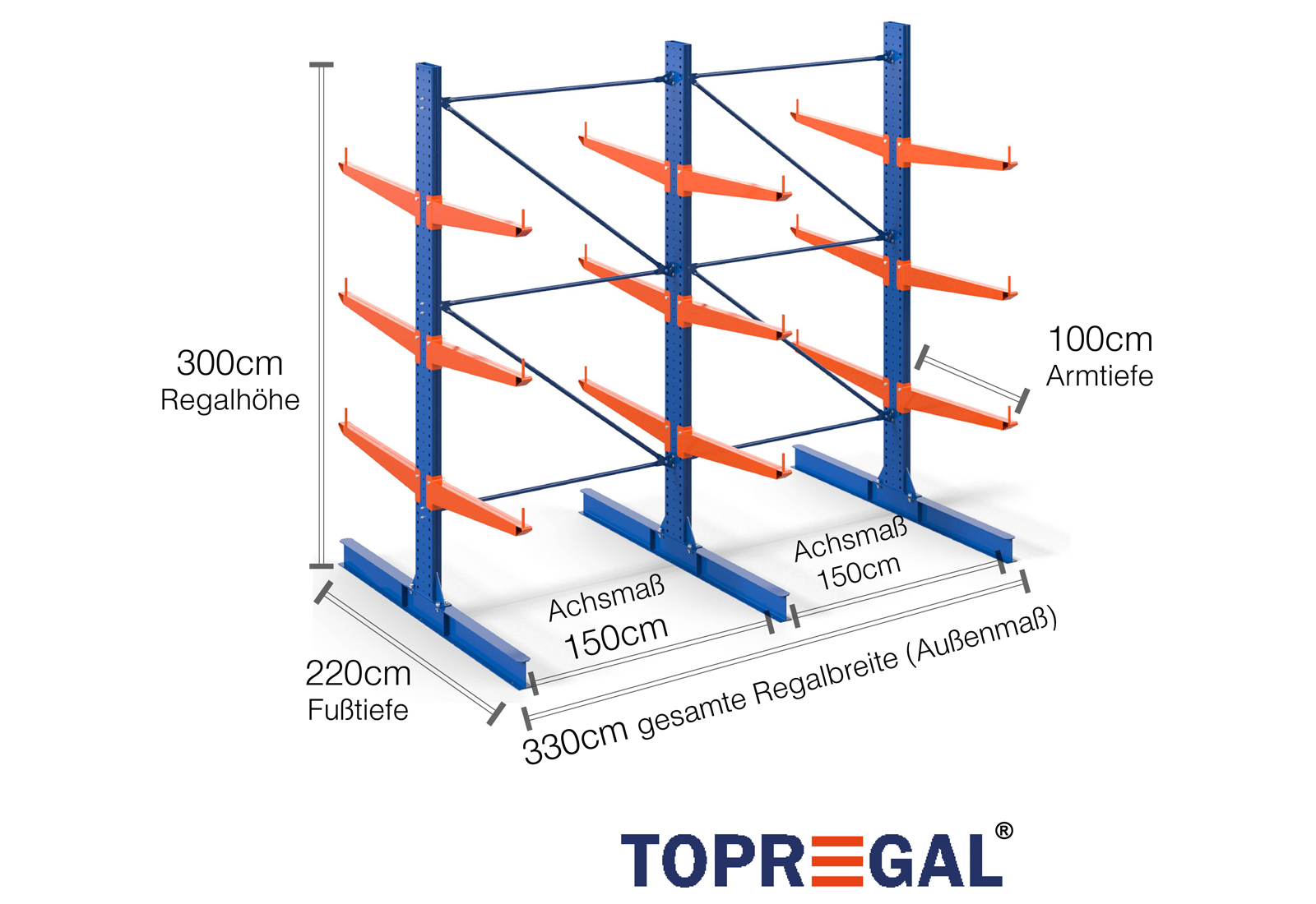 The axial dimension is the internal dimension between two shelf uprights. Depending on the cantilever type, we offer these fields in 120 cm (KR2500) and in 100 cm / 150 cm (KR3000 / KR6000).