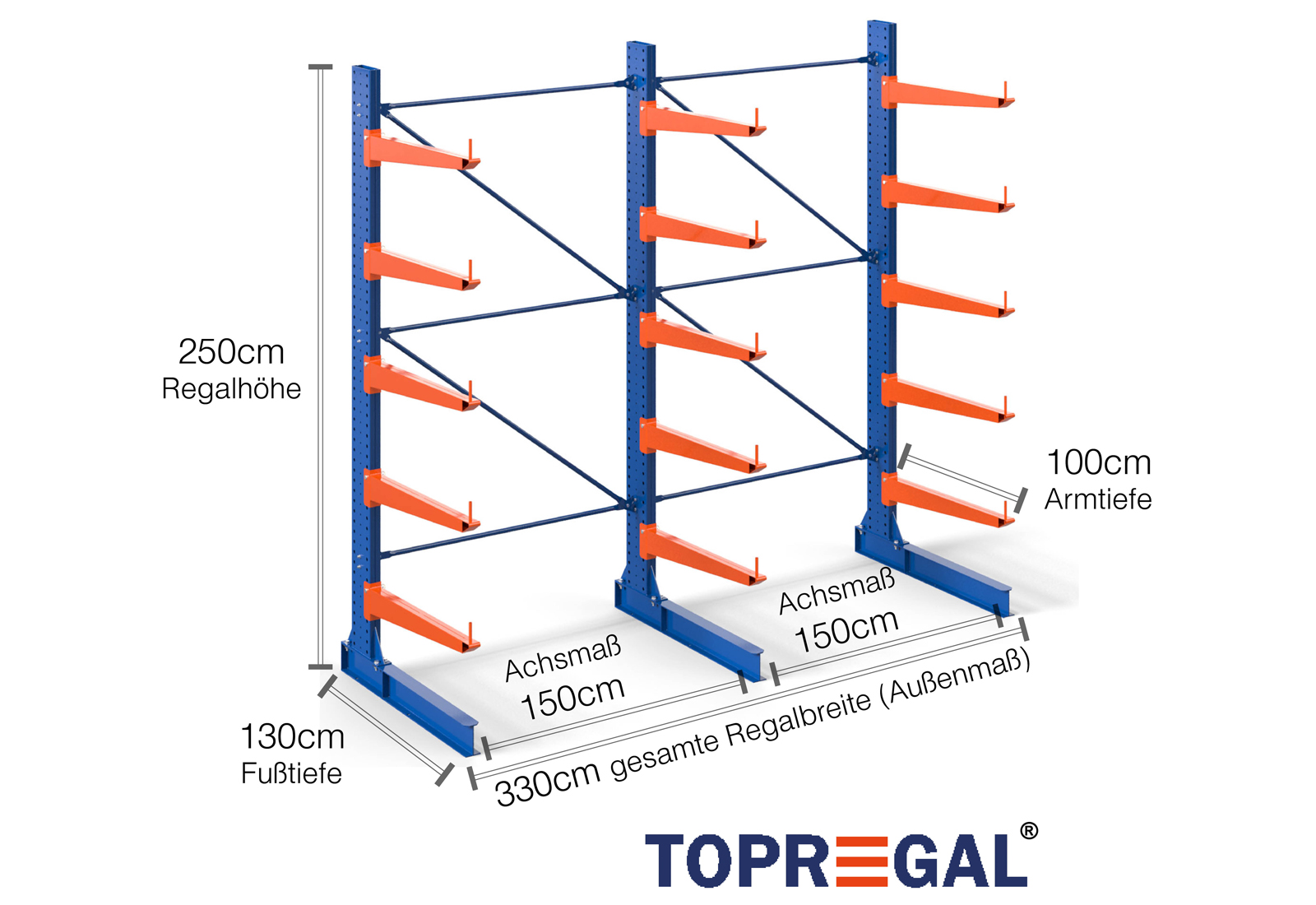The axial dimension is the internal dimension between two shelf uprights. Depending on the cantilever type, we offer these fields in 120 cm (KR2500) and in 100 cm / 150 cm (KR3000 / KR6000).